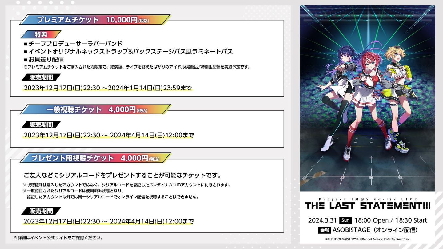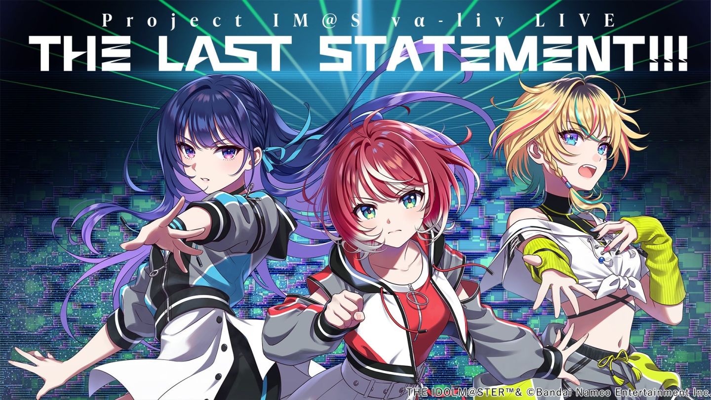 萬代南夢宮娛樂宣布,人氣 IP《偶像大師》系列首個虛擬偶像企劃「PROJECT IM@S vα-liv」(プロジェクト アイマス ヴイアライヴ)中的三位候選人將於 2024 年 3 月 31 日在 ASOBISTAGE 舉辦首次線上 Live 活動「-THE LAST STATEMENT!!!-」。