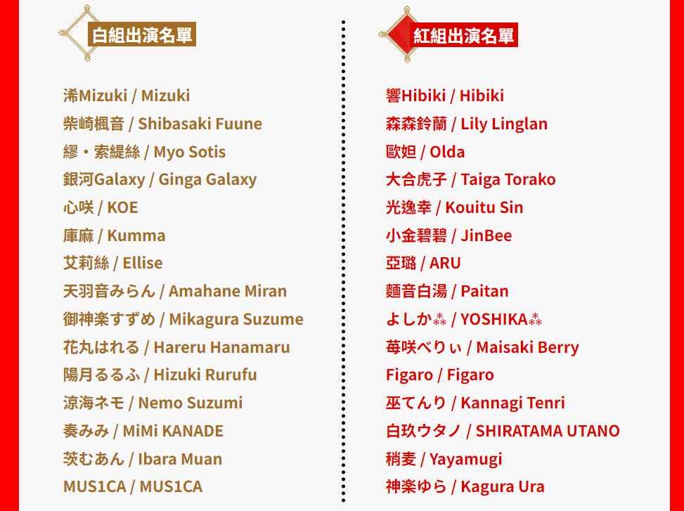 節目內容不但有 30 位日台 VTuber 的熱情獻唱,還有 6 位 Vtuber 的公募影片。究竟有哪幾位會出演公募影片又會帶來甚麼樣的精彩內容,還敬請期待當天的節目。除此之外,當天節目參與紅白投票的觀眾還有機會抽中豪華獎品!