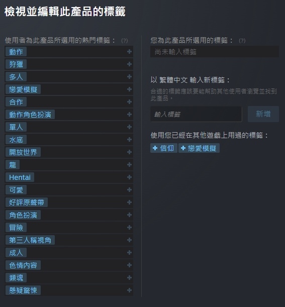 Steam 對於每款遊戲都有許多標籤分類,讓玩家更方便更容易找到喜愛的相關遊戲,使用者也能檢視編輯遊戲標籤,熱門標籤除了會顯示在介紹中,也有助於其它玩家搜尋,更能快速理解這是一款有著哪些要素的遊戲。