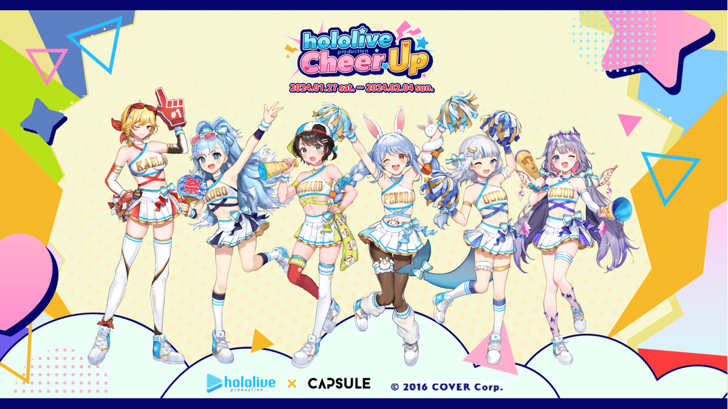 「Cheer UP」是由 CAPSULE 主辦,並與 hololive production 攜手推出的系列活動,而「Cheer UP 聯名主題快閃店」為該系列首波公開的活動,以「啦啦隊」作為主視覺風格,hololive 的 Oozora Subaru、Usada Pekora,hololive Indonesia 的 Kaela Kovalskia、Kobo Kanaeru,以及 hololive English 的 Gawr Gura、Koseki Bijou 共六位成員,皆換上一身藍白色系服裝,化身啦啦隊員帶給粉絲滿滿元氣!