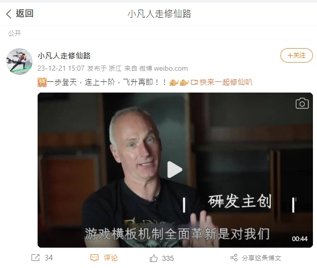 這支影片是在微博手機版上,隨著中國手機遊戲《凡人修仙傳:人界篇》一同出現的遊戲廣告影片,原影片由微博帳號 @小凡人走修仙路 發布,長度共 44 秒,以常見的訪談與實際遊戲畫面穿插方式來介紹遊戲。