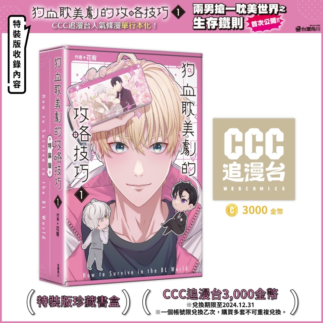 由台灣漫畫家「花宥」創作,於「CCC 追漫台」(原 CCC 數位平台)連載期間大受好評的爆笑 BL 漫畫《狗血耽美劇的攻略技巧》將推出單行本並同步發售特裝版,於 1/4 起開放預購,1/11 正式上市。