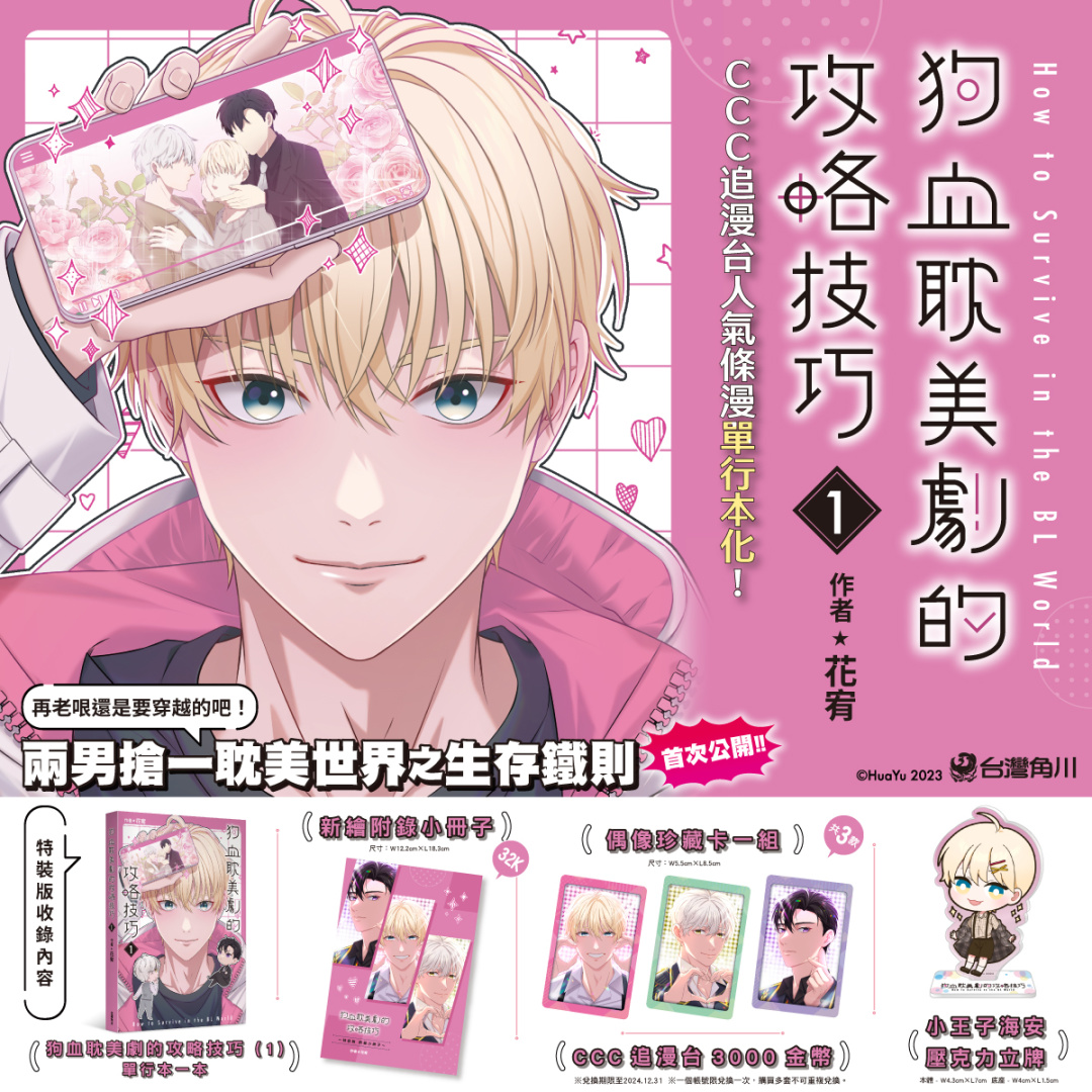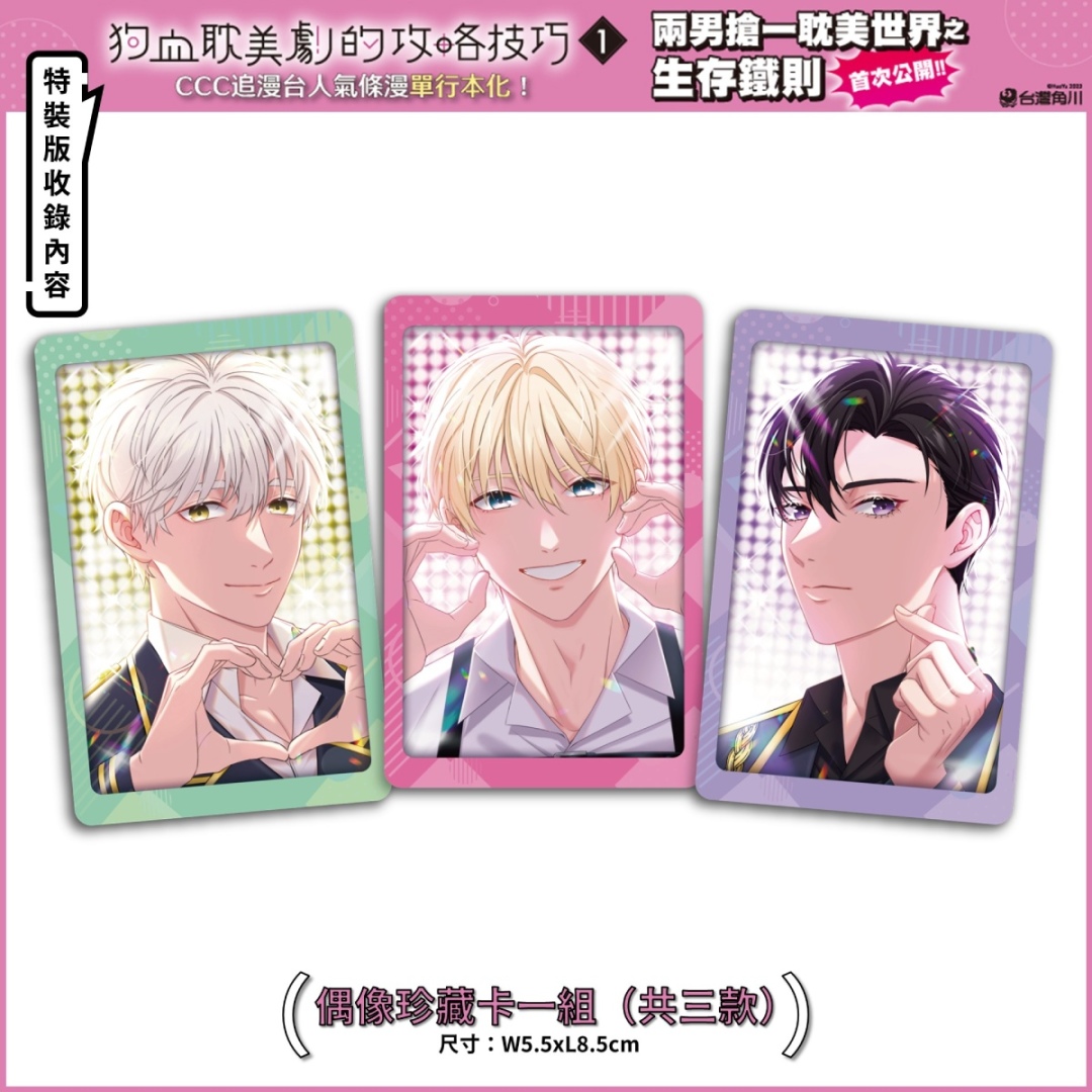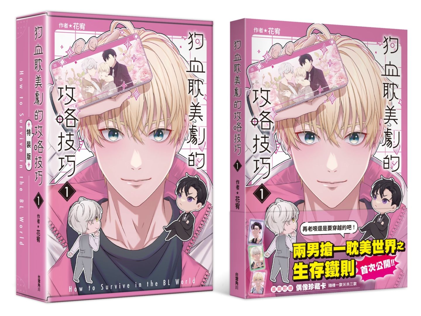 《狗血耽美劇的攻略技巧 (1)》單行本有新繪書封,首刷特典附贈隨機一款「偶像收藏卡」(共三款,首刷贈完即無贈品)。特裝版珍藏書盒收錄:新繪附錄小冊子、小王子海安壓克力立牌、偶像珍藏卡一組(三款)及 CCC 追漫台 3,000 金幣。特裝版即日起於台灣角川官網與全台指定實體&網路書店開放一週事前預購。上市後數量有限,售完為止,有意者請務必把握預購期間,以免向隅。