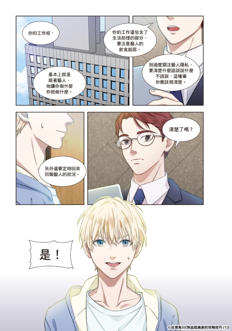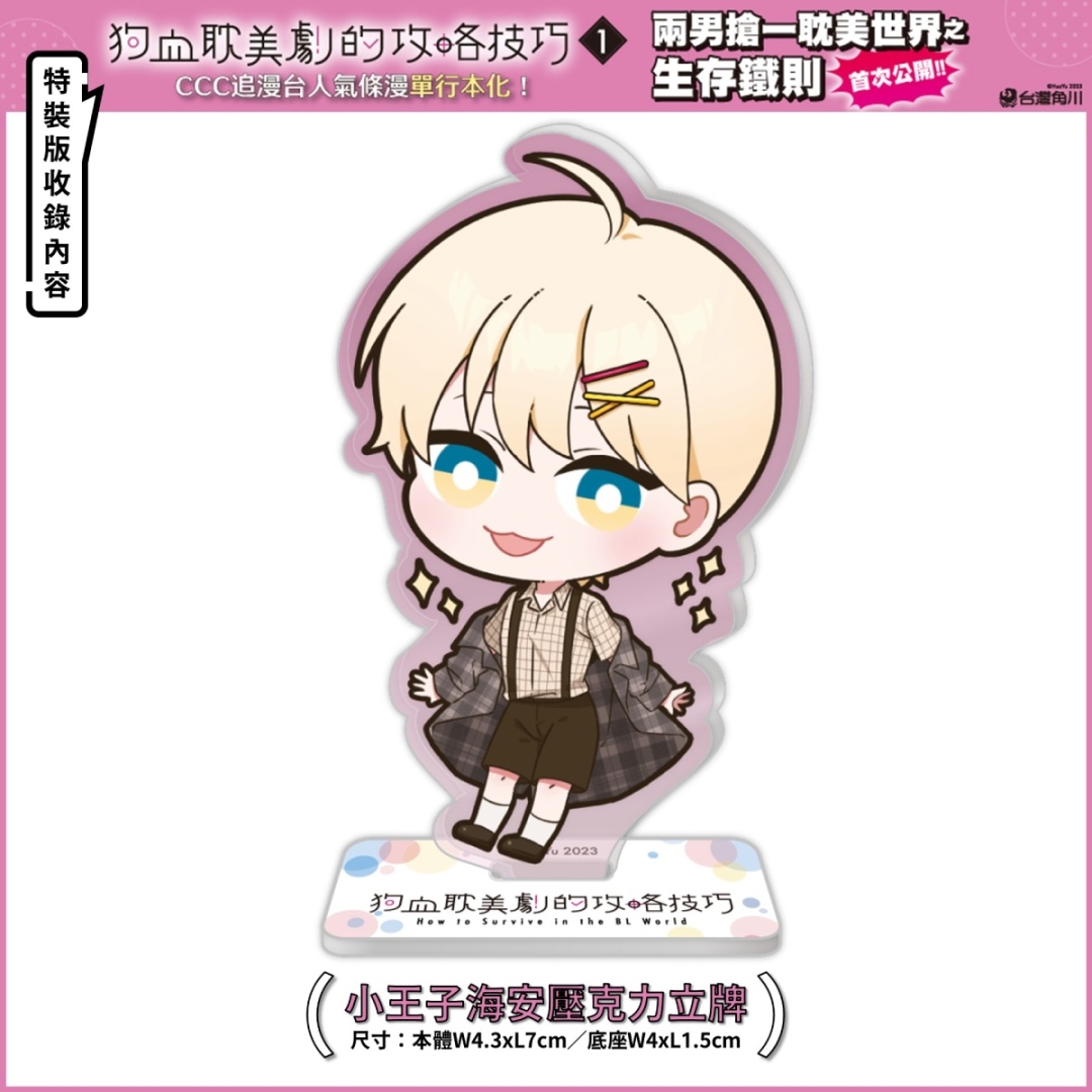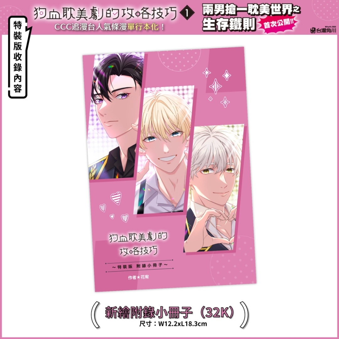 《狗血耽美劇的攻略技巧 (1)》單行本有新繪書封,首刷特典附贈隨機一款「偶像收藏卡」(共三款,首刷贈完即無贈品)。特裝版珍藏書盒收錄:新繪附錄小冊子、小王子海安壓克力立牌、偶像珍藏卡一組(三款)及 CCC 追漫台 3,000 金幣。特裝版即日起於台灣角川官網與全台指定實體&網路書店開放一週事前預購。上市後數量有限,售完為止,有意者請務必把握預購期間,以免向隅。