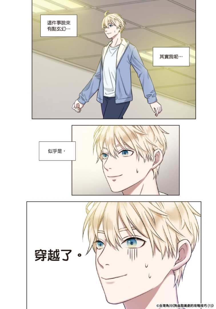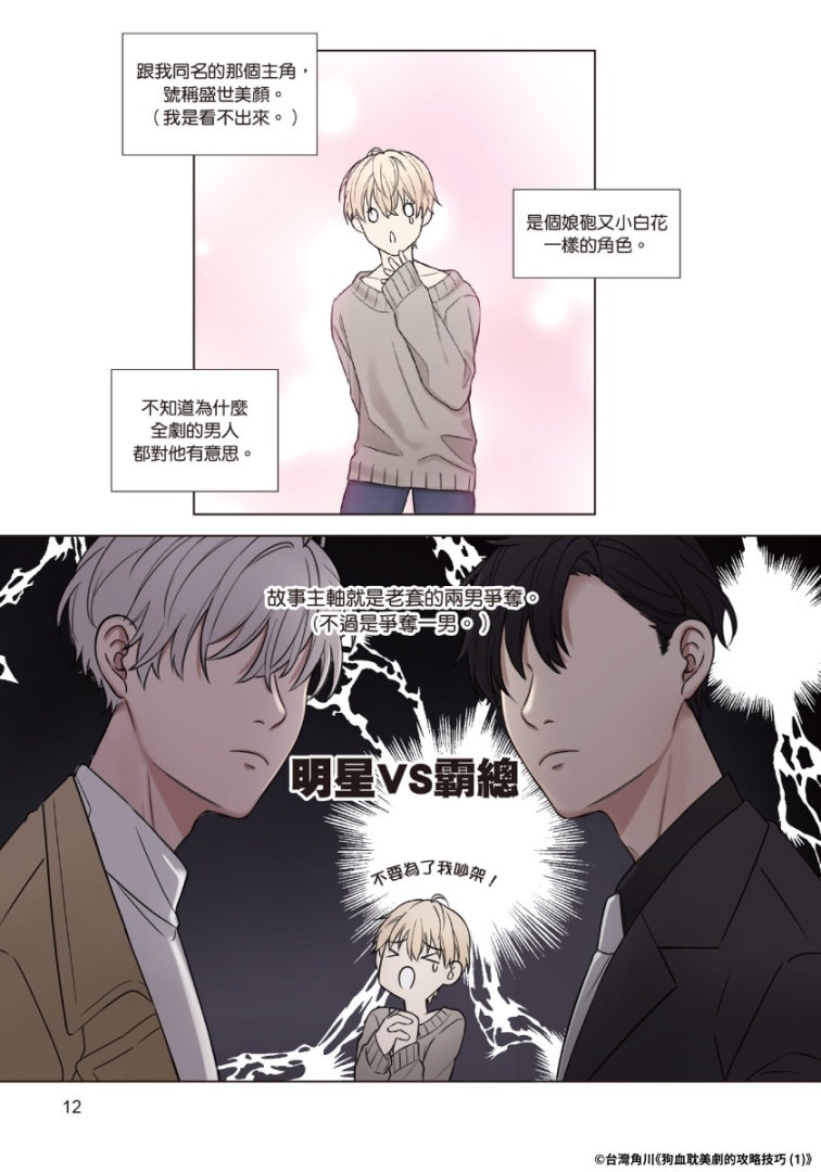 25 歲的保鑣「季海安」原本是個與甲甲世界無緣的鋼鐵直男,卻在一次下班休息打開電視時,發現在某部狗血耽美劇裡,那個夾在超人氣偶像和霸道總裁之間,號稱盛世美顏的小白花男主角,竟然與自己同名?!結果竟不自覺的追了起來。這部八點檔 BL 劇故事簡單老哏,季海安一邊吐槽一邊追,也在不知不覺中追到了大結局,加班蹲廁所也要準時看完,迎來意料中的 Happy Ending 後神清氣爽……但他竟穿越到戲裡面了?!《狗血耽美劇的攻略技巧 (1)》將於 1/11 正式發售!