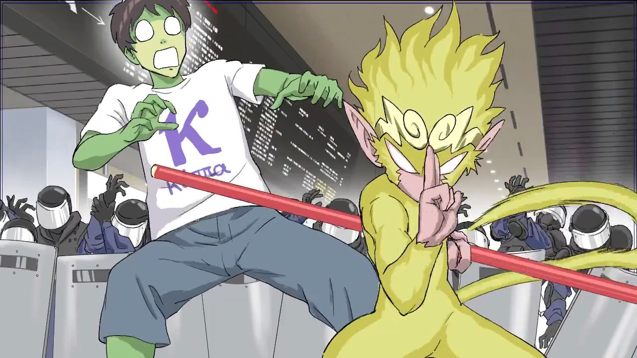 開車的是玄奘,而配備重火力的女孩應該就是八戒(在這裡取名為ロース,暫譯為洛絲,是里肌肉的意思)了,兩人知道金色猴子就是齊天大聖──惡魔之王!在逃避各種追殺的過程中,從警察到一般的妖怪,然後出現了妖鬼、妖魔,就在狀況危急之時,一行人看見了齊天大聖的真正強度......