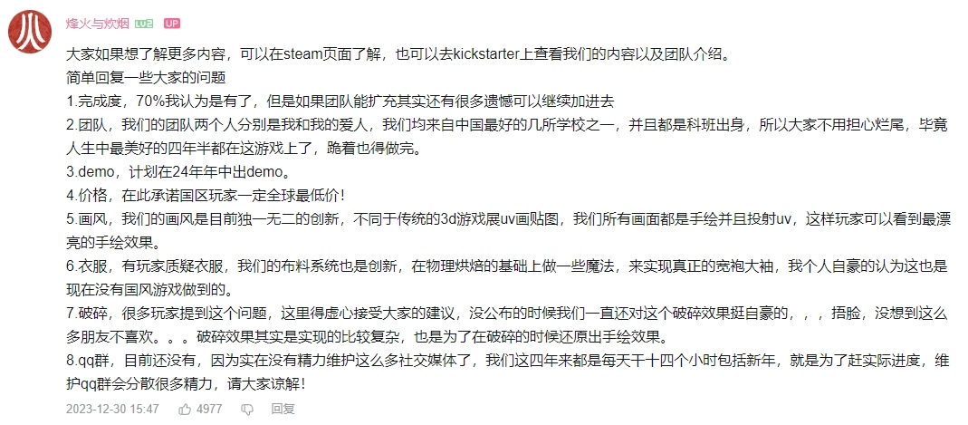 由於其規模實在太龐大、系統也過於多樣繁雜,事實上單憑其中數項特點都能獨立製成遊戲了,要在單一遊戲中如此包山包海,憑著兩人團隊是否真能做出令人滿意內容令人好奇,再加上先前《浩劫前夕》詐騙先例,《烽火與炊煙》的規模與開發人力落差,讓許多玩家對其抱以觀望態度。在 Steam 討論區及其新開的 Biliblili 頻道中均有許多玩家提出疑問與意見,而開發者也統一給予答覆。
