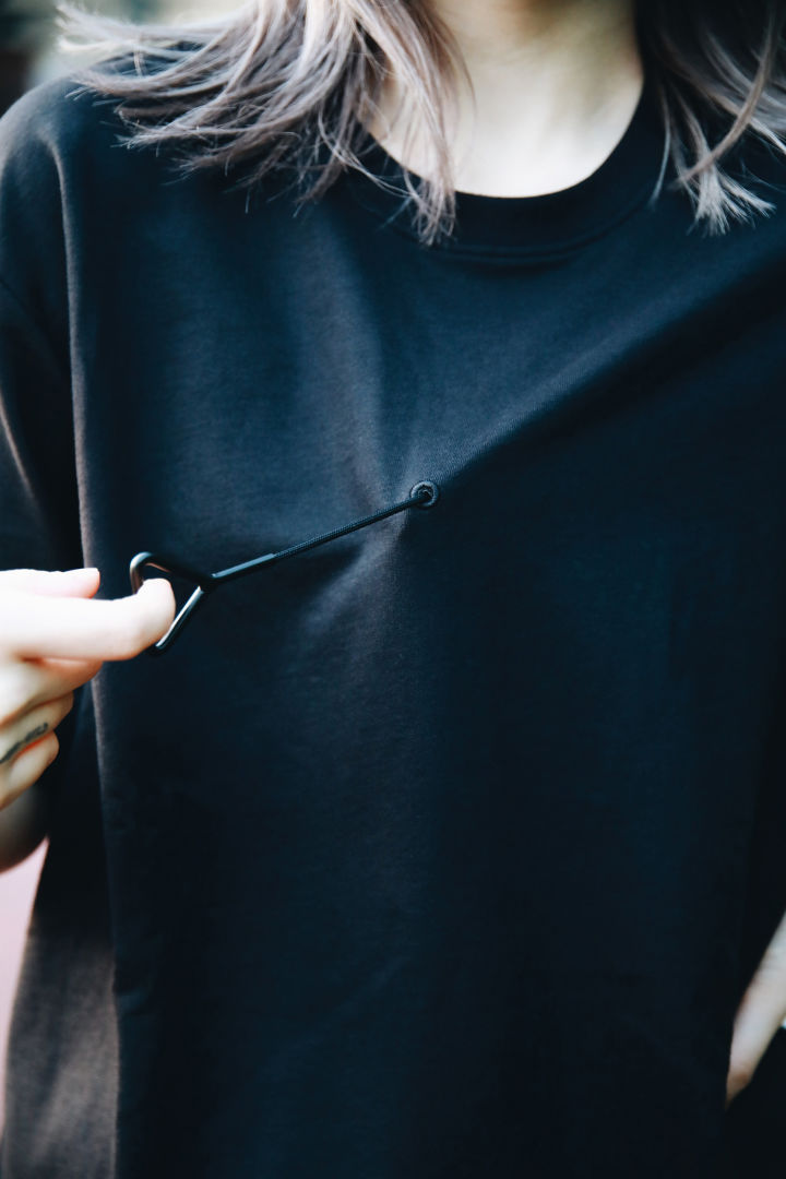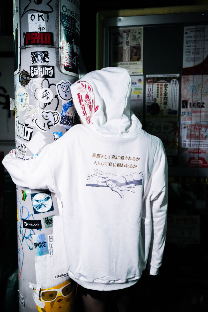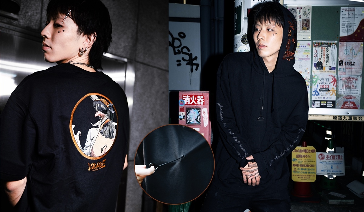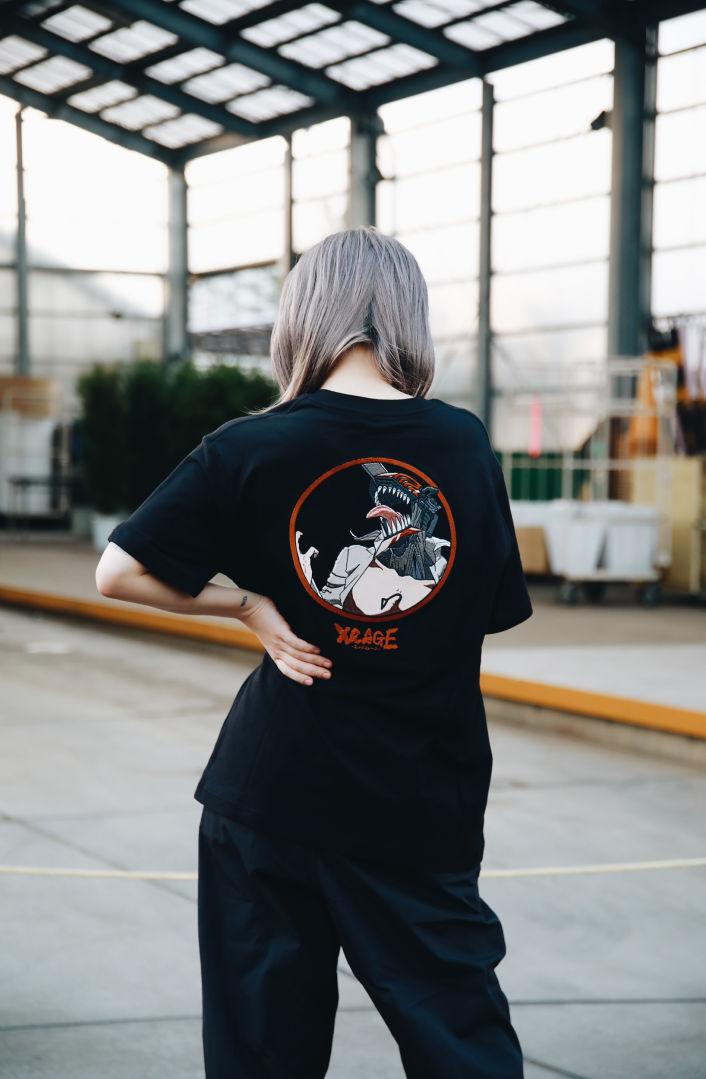 XRAGE 將惡魔意象化推出 T 恤、帽 T,各以刺繡方式精緻呈現,淀治-鏈鋸人款短袖 T 恤以金屬輔料還原化身惡魔開關的拉環,鏈鋸人款帽 T 還有兩袖上的刀片刺繡;真紀真款帽 T 以經典手勢為主題、早川秋款帽 T 以未來惡魔為主題,袖子上還有香菸字樣讓人聯想經典名場面。