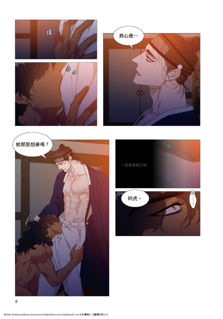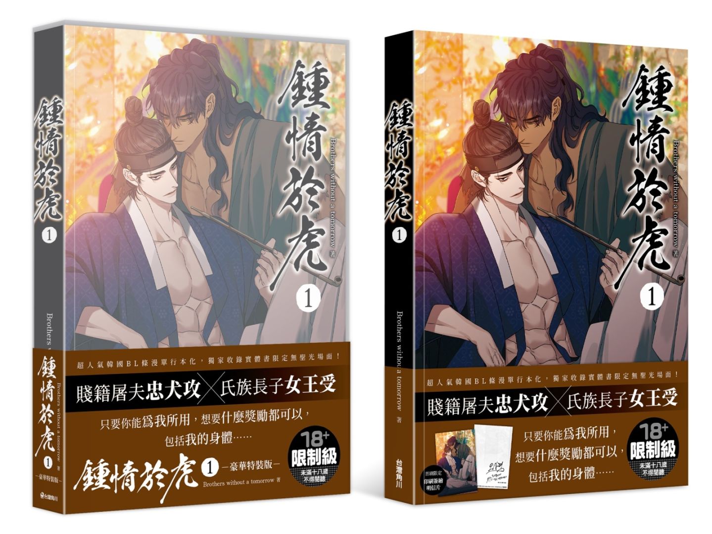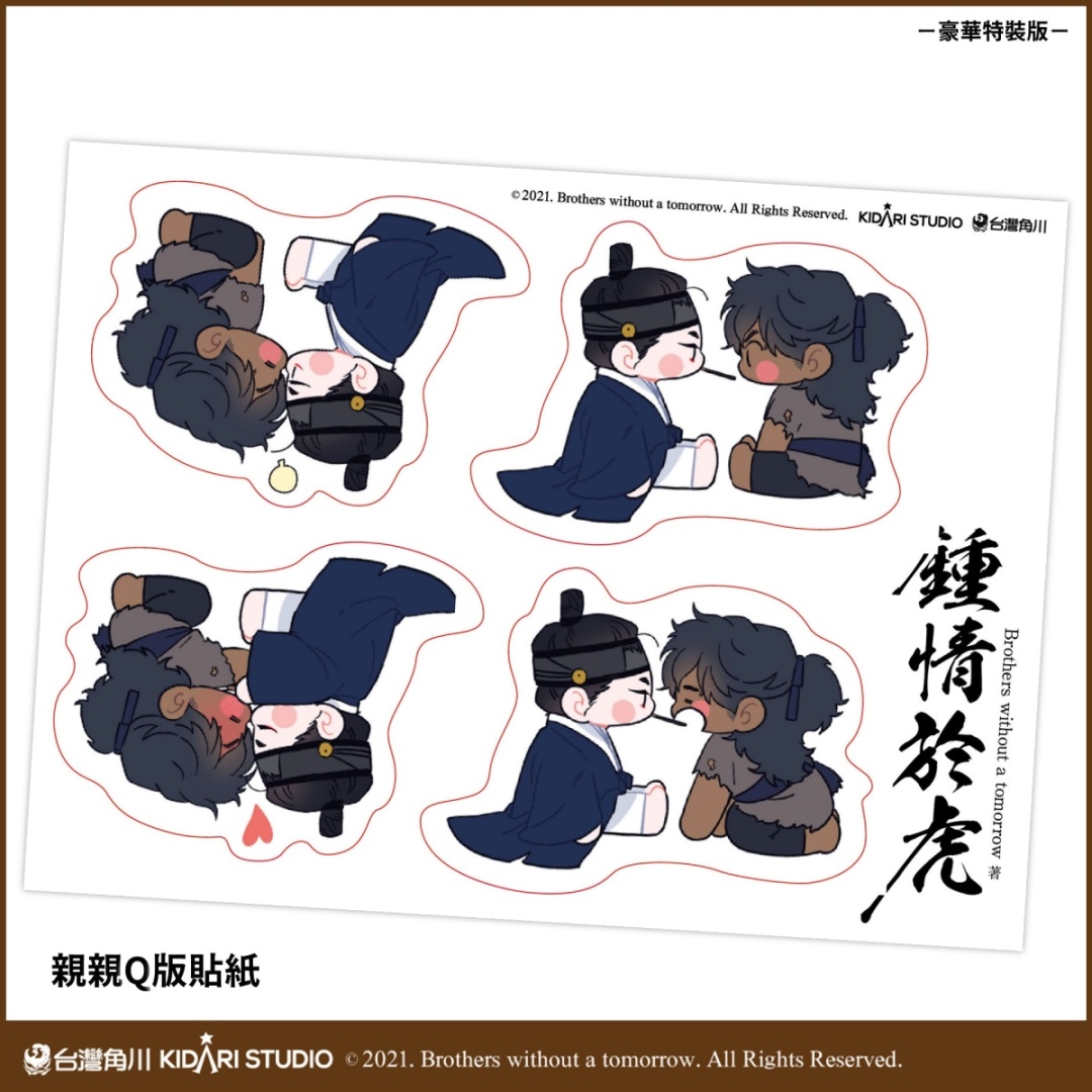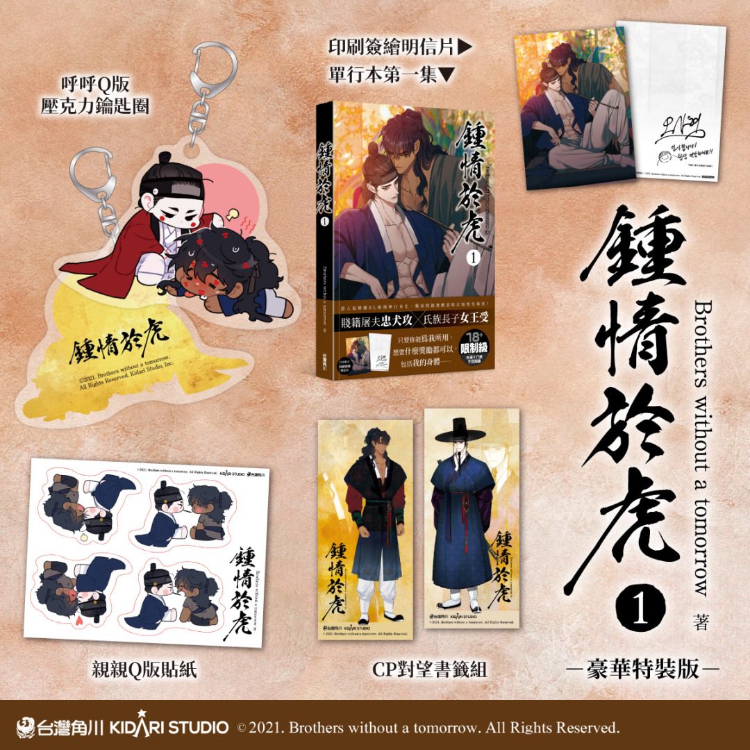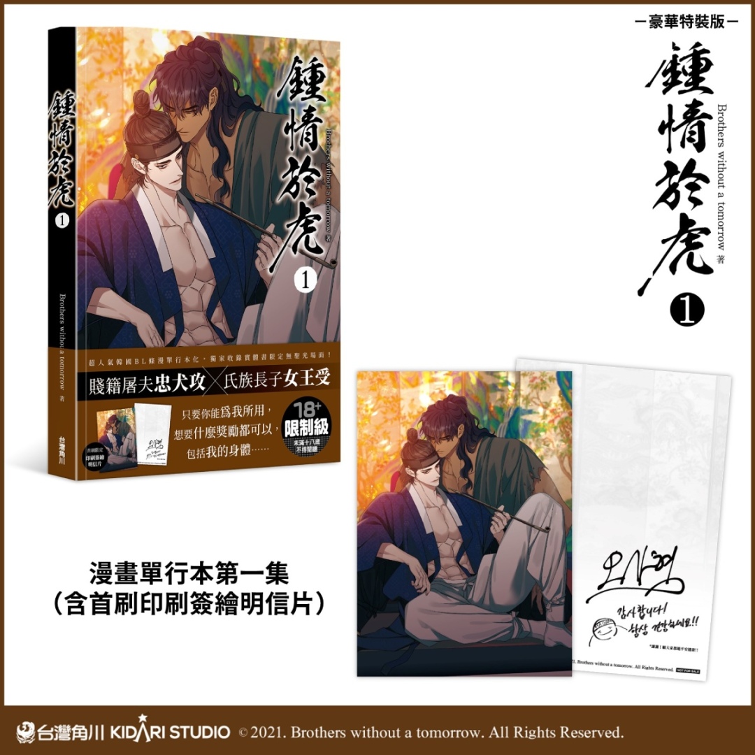 由 X(推特)擁有 46 萬追蹤的人氣韓國漫畫家 Brothers without a tomorrow 所創作,話題古風 BL 條漫《鍾情於虎》將在 2024 台北國際動漫節發售實體書單行本,獨家收錄實體書限定無聖光場面及首刷特典,並同步發售豪華特裝版!作者 Brothers without a tomorrow 筆下細緻唯美的畫風,搭配香豔激烈的官能場面,雙向執著的禁忌愛戀令人心跳加速,深受廣大讀者喜愛!