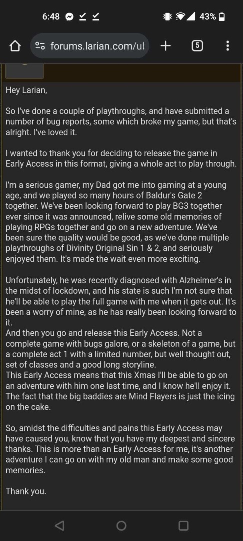 在該貼文中 Solfalia 解釋他和父親經常一起玩角色扮演遊戲,特別是早期的《柏德之門2》,以及拉瑞安先前作品《神諭:原罪》系列,所以兩人都非常期待《柏德之門3》到來,然而在 2020 年隔離期間,他父親被診斷出患有失智症。而《柏德之門3》即時推出的搶先體驗,提供兩人「最後一次合作冒險」的機會。