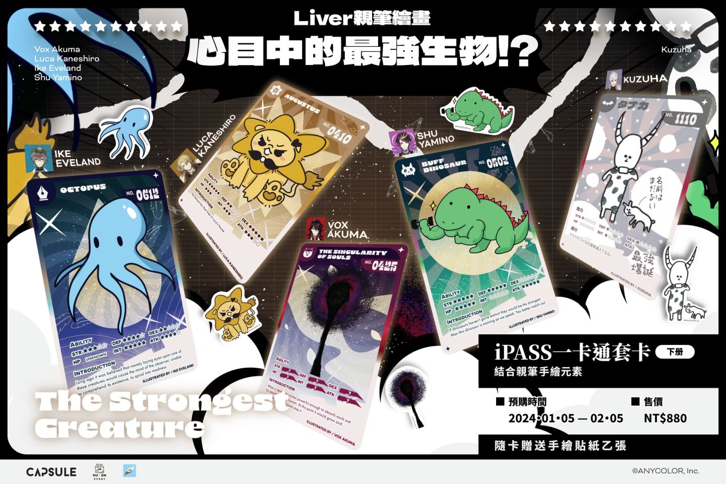 延續第一波 NIJISANJI 「iPASS 一卡通套卡<上冊>」的購買熱潮,近期官方再度宣布推出粉絲期盼已久的下冊套卡,本次的視覺設計以 NIJISANJI EN 四期生「Luxiem」四位成員 Ike Eveland、Luca Kaneshiro、Vox Akuma、Shu Yamino 以及 にじさんじ「葛葉 Kuzuha」的親筆手繪作為主題,由 Liver 畫出他們心中認為的「最強生物」,到底誰親手創造的生物會奪得最強的稱號,史詩級的大戰結果由你來預測!「最強生物 iPASS 套卡」將於 1/5 在 Cmer 電商網頁開放預購,想蒐集 Liver 親筆手繪限定商品的你,千萬不能錯過!