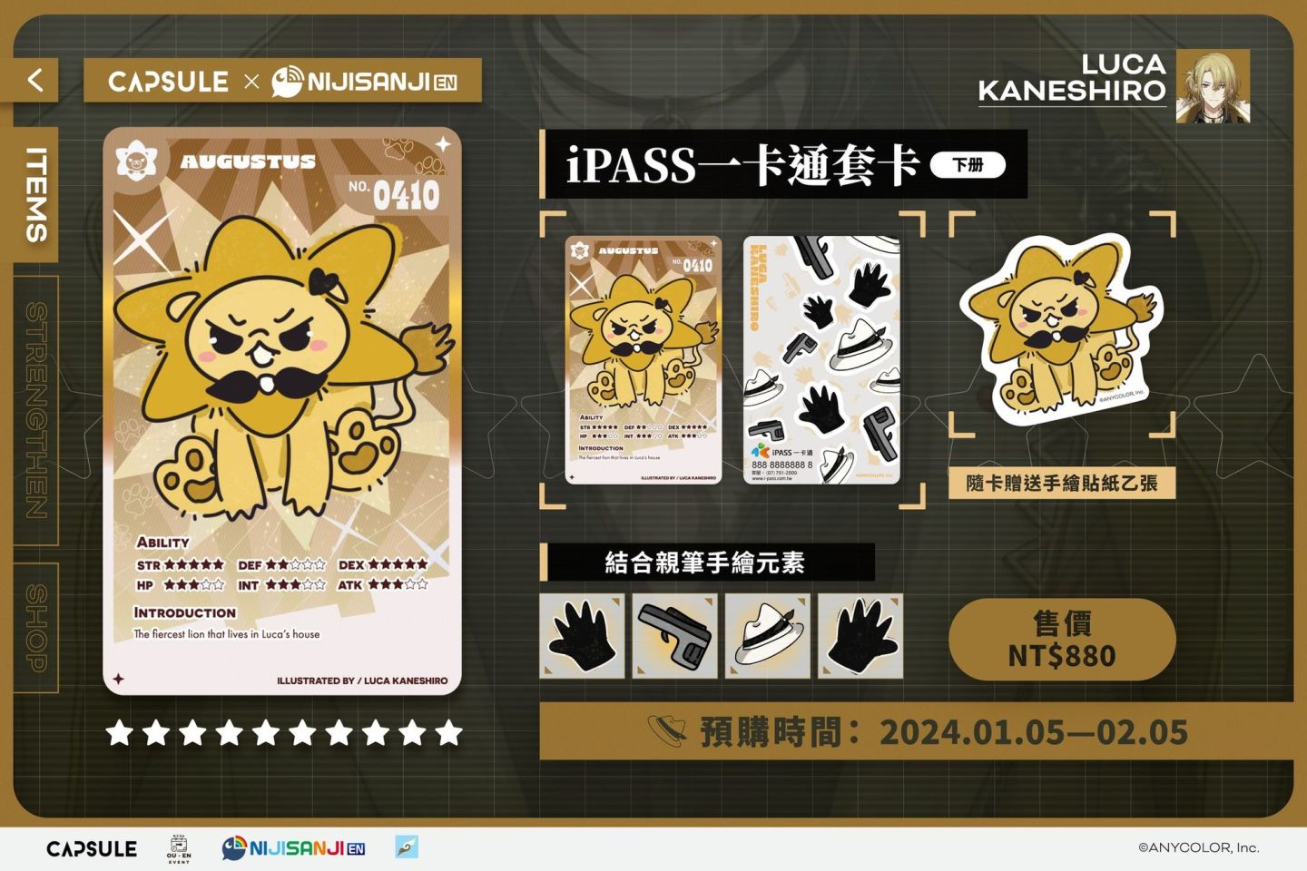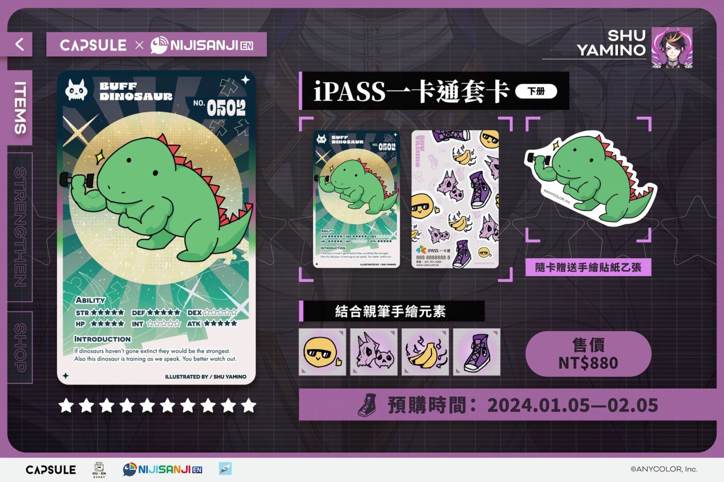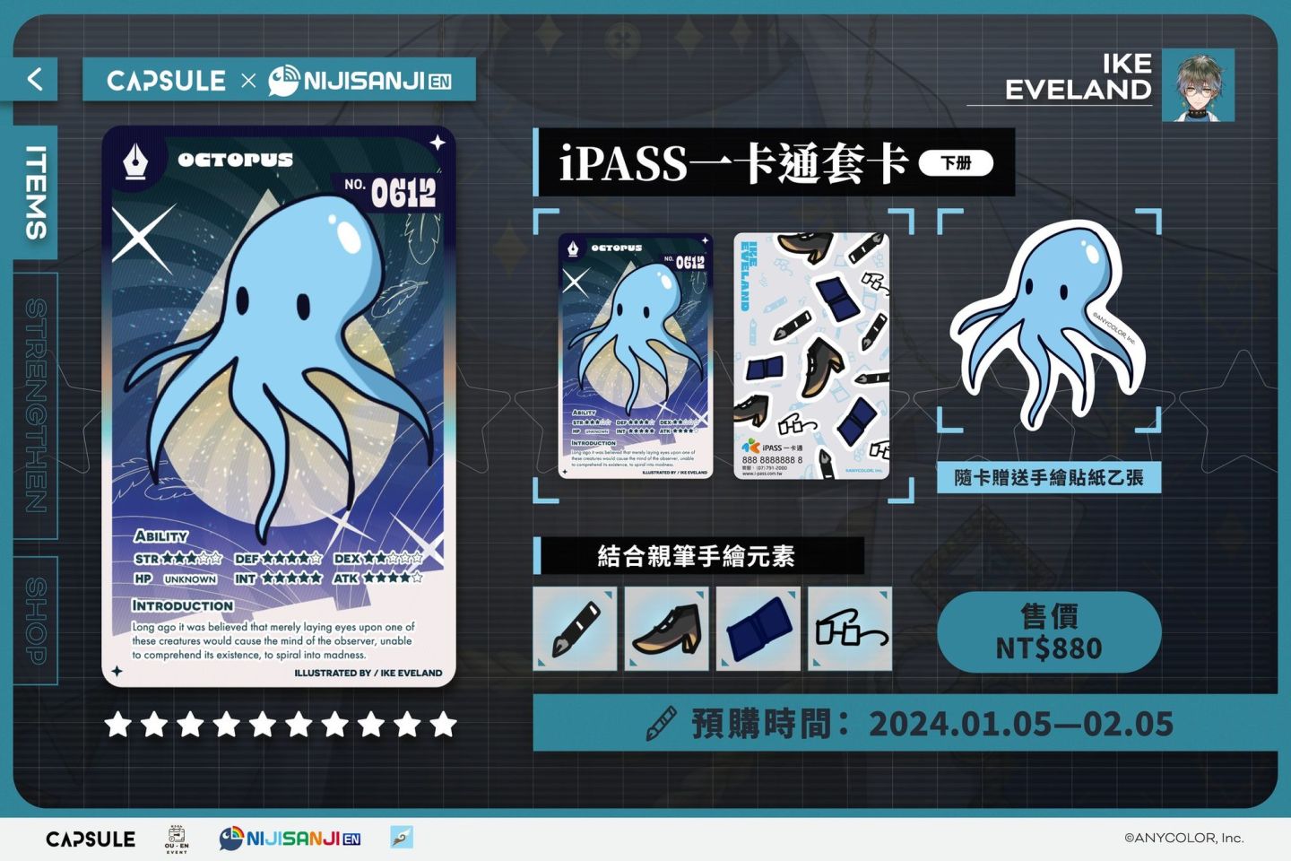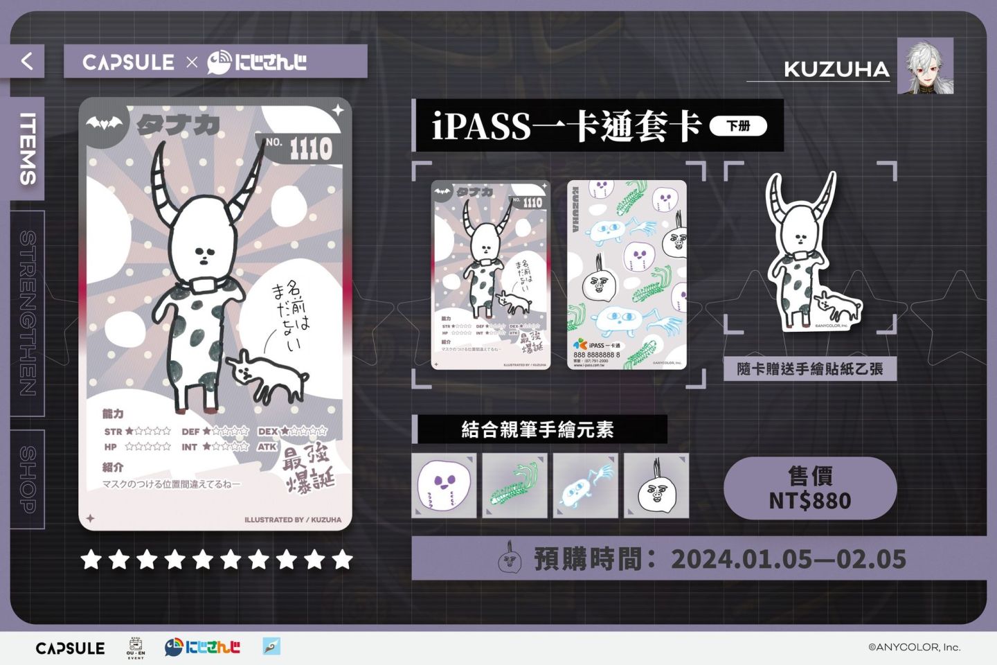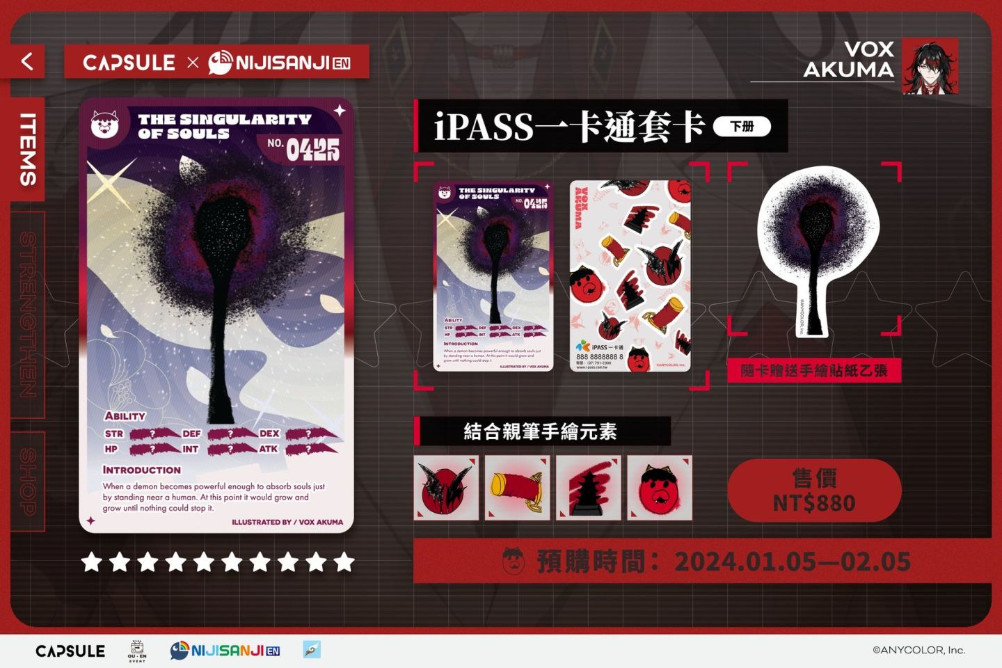 本次與 NIJISANJI 聯名的五款「iPASS 一卡通套卡<下冊>」售價一組為 NT$880 元, 於 1/5(五)~ 2/5(日)透過 Cmer 電商網頁開放全球粉絲預購。後續更多消息請持續關注 OU-EN EVENT 官方社群。