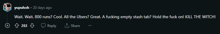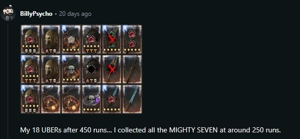 在 Reddit 討論區中,玩家 Direction-Opposite 分享了一支影片,並宣稱在 刷了 800 次、歷經 1 個月後,他終於可以退休了,而影片中則展示現有的 7 件超強獨特裝備。