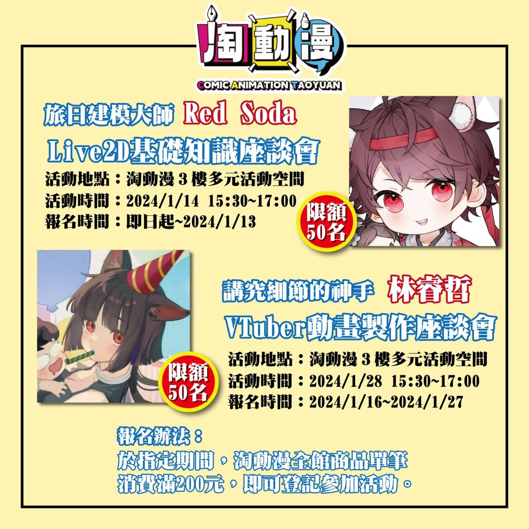 此外,「淘動漫」也為對於剛接觸 VTuber 以及想成為 VTuber 的新手們舉辦了趣味及知識量滿滿的教學座談會,每場座談會限額 50 人。1 月 14 日邀請到致力於 Live2D 建模教學的 SODAART 創辦人的旅日建模大師 Red Soda 老師特別回到台灣為大家舉辦「Live2D基礎知識座談會」;1 月 28 日則邀請到同屬於 SODAART,人稱「講究細節的神手」的林睿哲老師主講「VTuber動畫製作座談會」。想要參與這些座談會的朋友們,只要在「淘動漫」全館單筆消費滿 200 元並現場實名登記,即可參加。