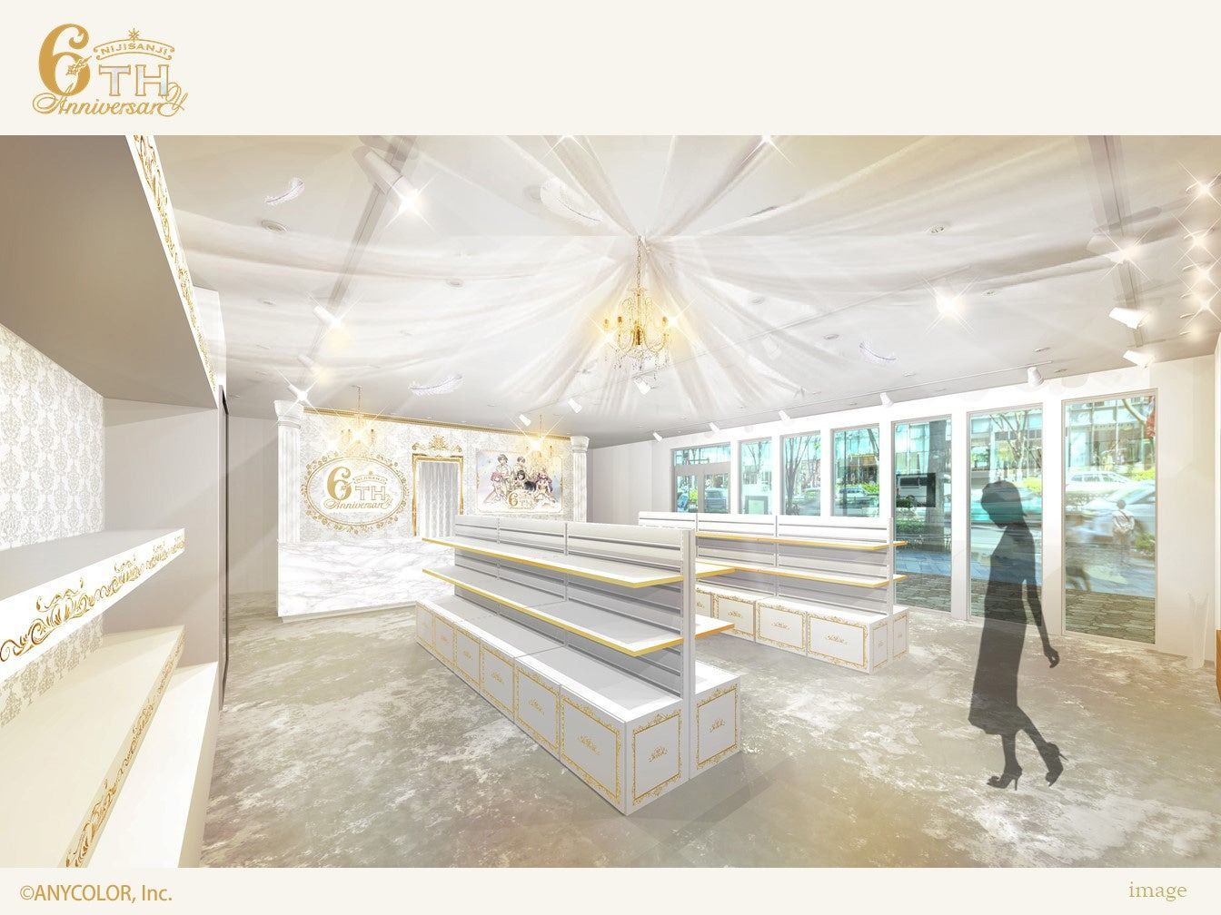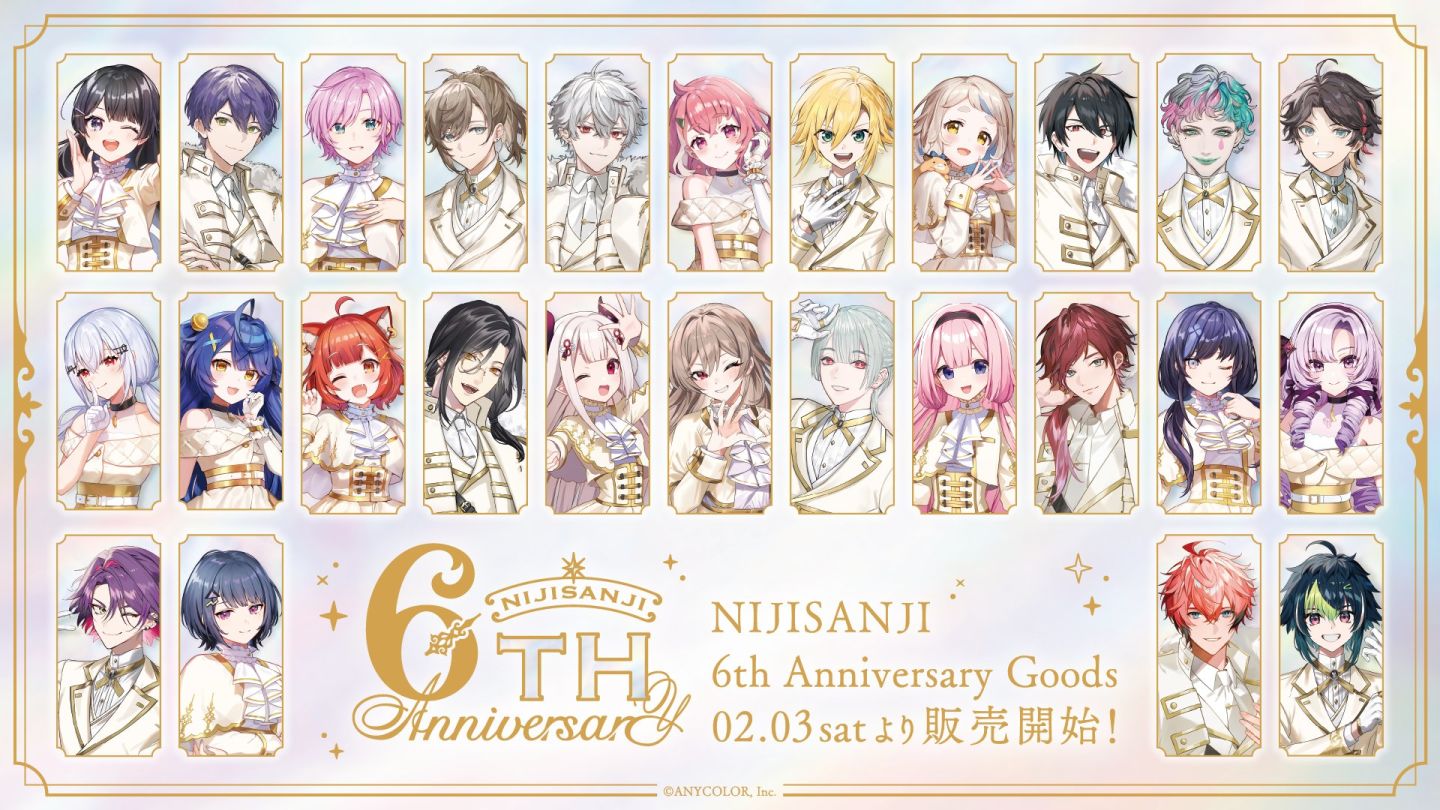 商品陣容將會有壓克力立牌、透明文件夾、拍立得風卡片、萬用收納包、刻字項鍊墜飾、拍立得風卡片立牌,以及採預約生產製的角色印刷畫;此外自 2/3 起會在原宿竹下通舉辦「6th Anniversary shop」期間限定店活動,不僅會販售「6th Anniversary」紀念周邊,還會出售及展示各種商品,請粉絲與 Vtuber 們共同迎接彩虹社六週年!