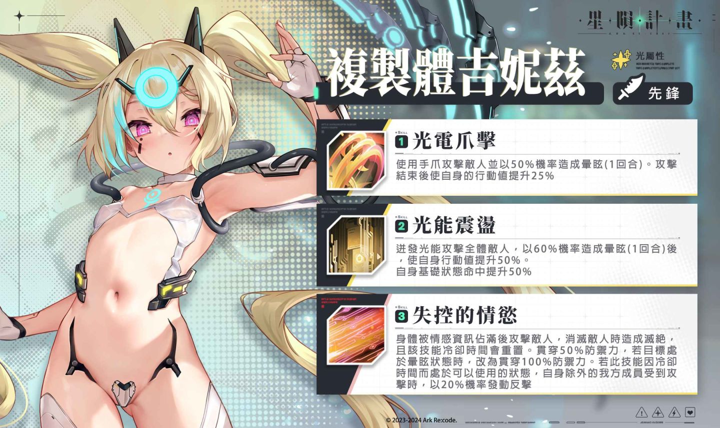 「複製體吉妮茲」的技能 1、2 皆具有可以暈眩敵人的特性,配合上「複製體吉妮茲」的技能 3 可以造成大幅的全體傷害!此外「複製體吉妮茲」的技能 3 擁有「滅絕」特性,可以讓擁有復活特性的敵人無法進行復活,且用此技能消滅敵人時還能夠重製此技能冷卻!