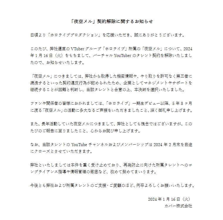 Cover 於今(16)日宣布,旗下 Vtuber 事務所 hololive 一期生成員「夜空梅露」(夜空メル),因做出違反合約的行為自即日起解約,Youtube 頻道與會員資格將在 2 月底關閉。