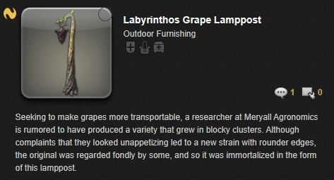 在更新後實裝的葡萄燈飾是用戶「ましゅしゅ」在 2022 年「家具設計大賽」(調度品デザインコンテスト2022)中獲獎的作品,該企劃旨在募集玩家的創意和設計,並將獲獎作品製作成遊戲中的家具;遊戲內文字介紹說「一個彩色玻璃街燈,其形狀是メリオール實驗農場曾經種植的一種形狀獨特的葡萄」,即便原版的葡萄已經被更新,但那愛不釋手的稜角模樣現已化為家具陪伴在光戰身邊了。
