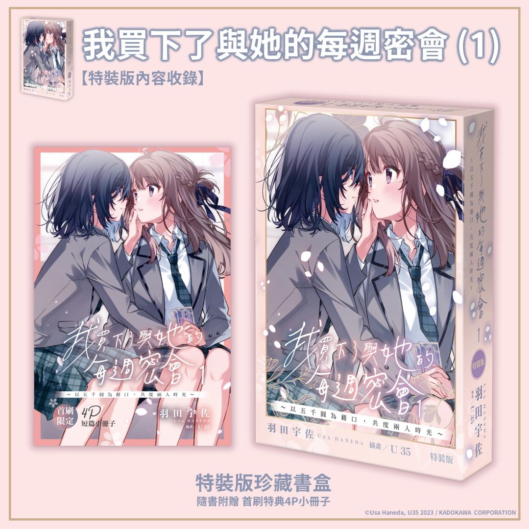 特裝版即日起在台灣角川官網與全台指定書店開放事前預購,於官網預購,回饋加碼再送一萬點紅利點數。《我買下了與她的每週密會(1)》預定於 2024 年 3 月下旬正式發售!特裝版上市後數量有限,有意者請務必把握預購期間以免向隅。