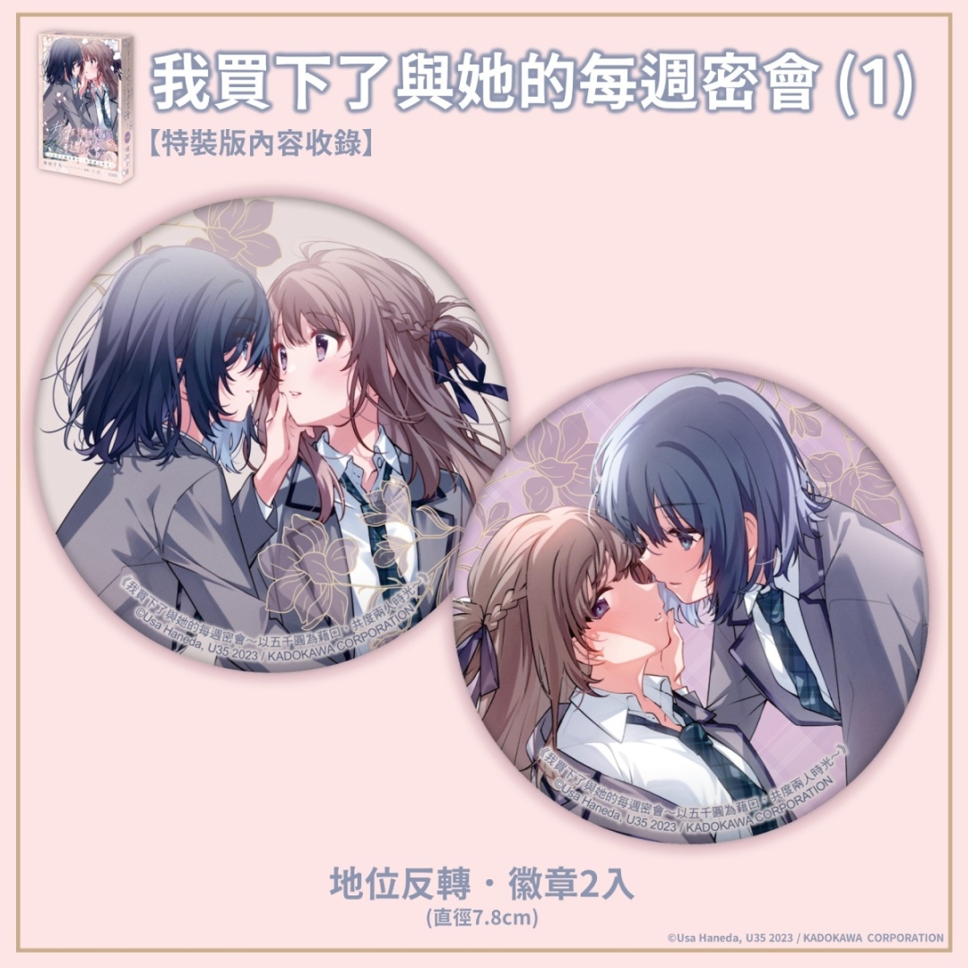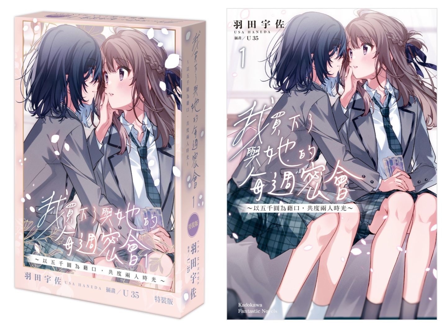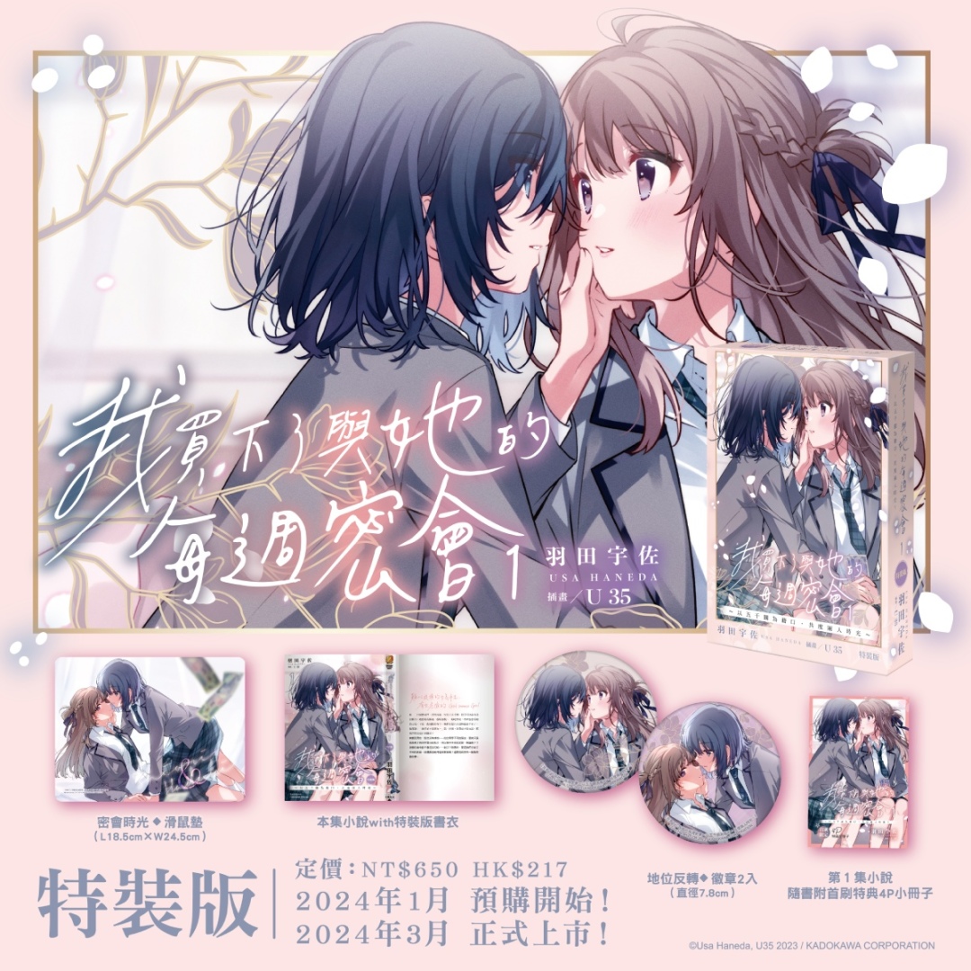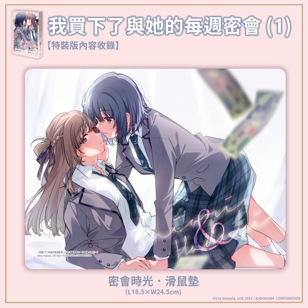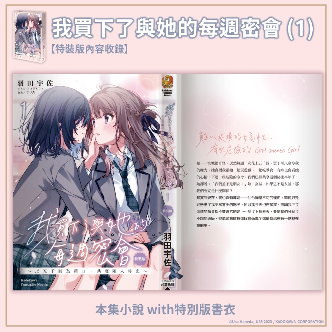 難以捉摸的女高中生,有些危險的 Girl Meets Girl!《我買下了與她的每週密會~以五千圓為藉口,共度兩人時光~(1)》隨書附贈「首刷特典 4P 小冊子」;(特裝版)以兩位女高中生的甜蜜互動為主題設計「特裝版珍藏書盒」收錄珍貴特典「密會時光.滑鼠墊」、「地位反轉.徽章2入」以及「本集小說with特別書衣」。