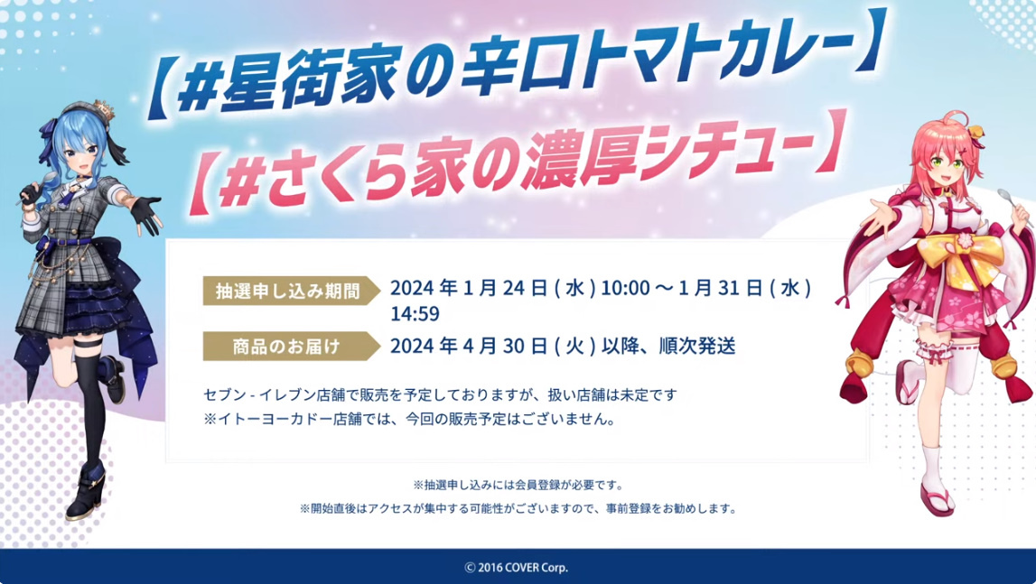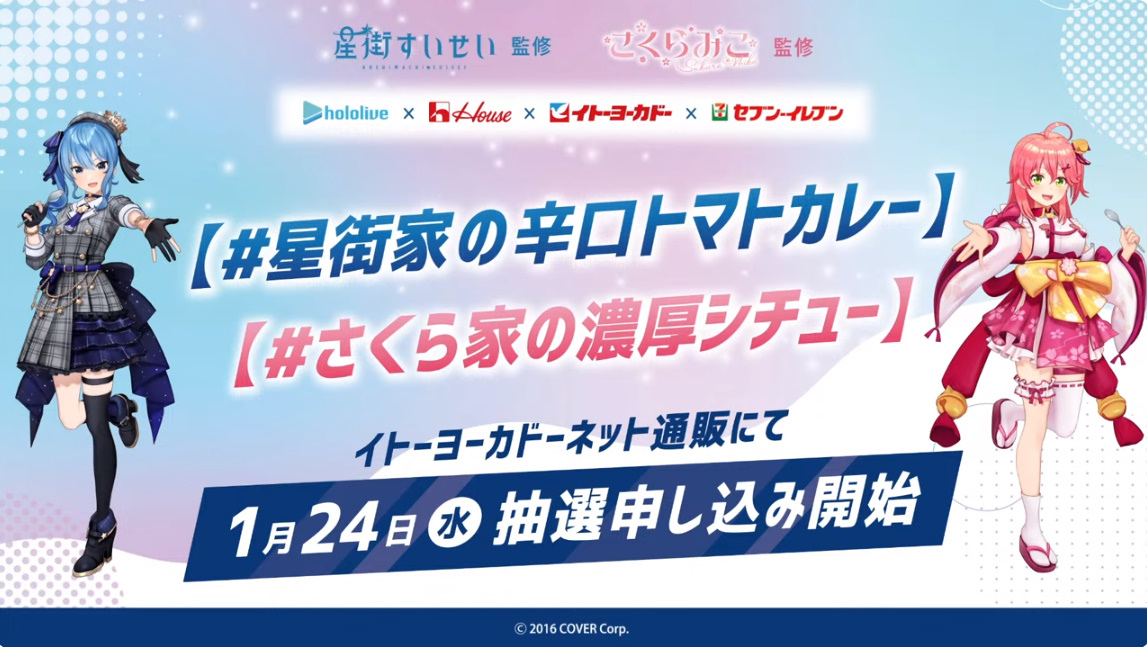 hololive 人氣 Vtuber 星街彗星和櫻巫女繼日前宣布將再度與ハウス食品、業務超市イトーヨーカドー和日本 7-11 合作,推出廣受好評的咖哩調理包「星街家咖哩」(#星街家のカレー)第二彈和新品「櫻巫女家的燉菜」(さくら家のシチュー)後,在 1 月 17 日晚間的直播中宣布將從 1 月 24 日起於イトーヨーカドー網路商店開放抽選申請。