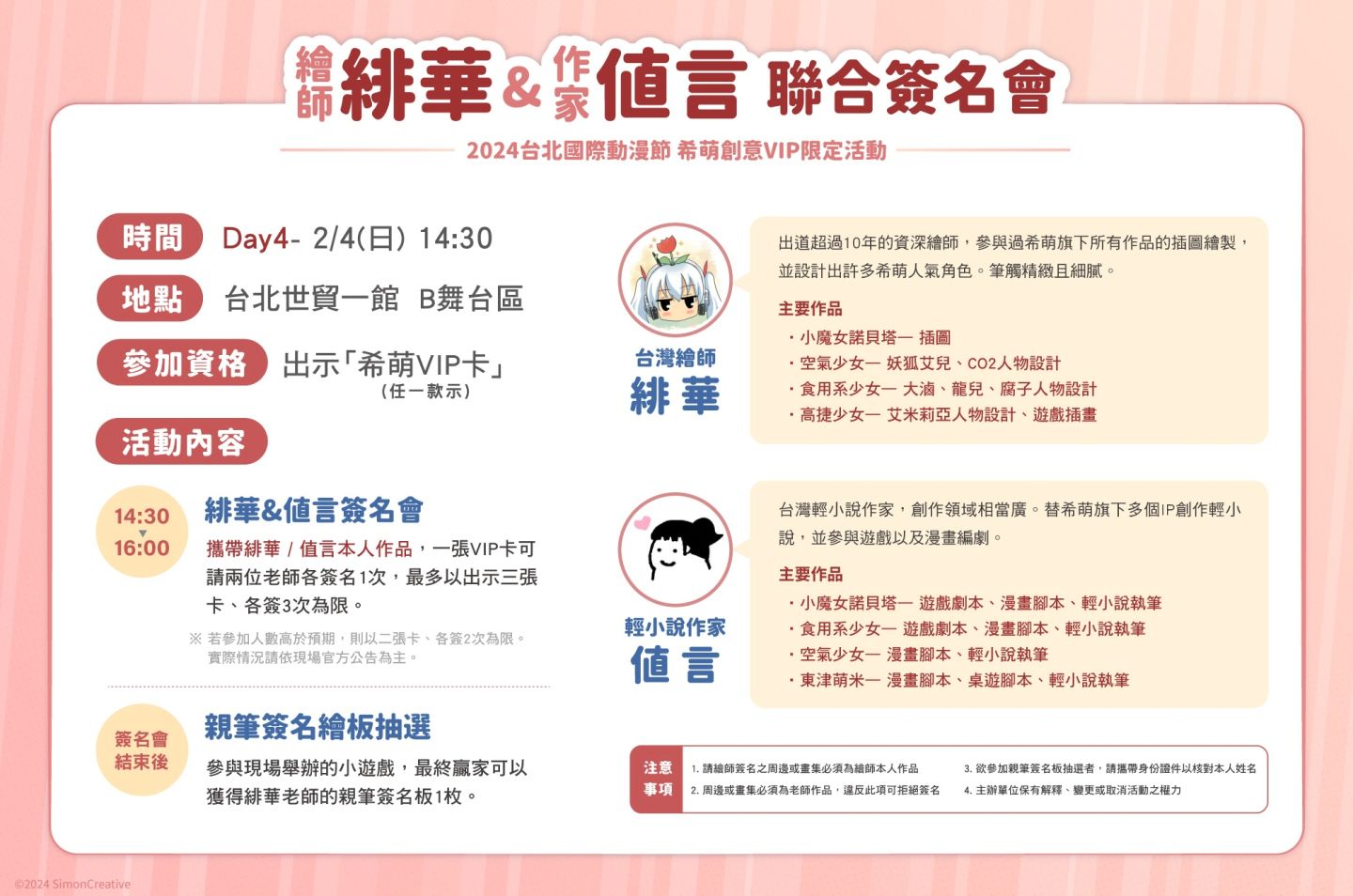 另外,參與《緋櫻白狐》遊戲美術的繪師緋華,以及撰寫遊戲劇本的值言老師,將於台北國際動漫節第四日(2 月 4 日 14:30~16:00)舉行聯合簽名會,只要出示希萌創意 VIP 卡即可參加。喜歡兩位老師作品的朋友不要錯過!