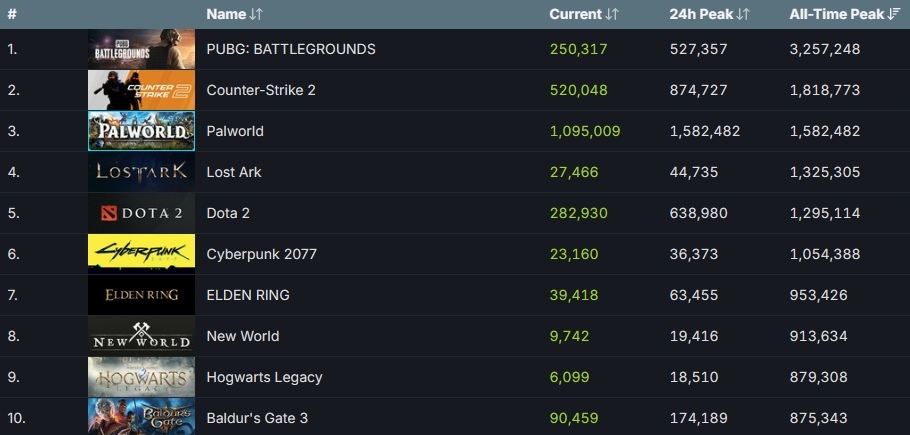 同一時間點,同時上線人數也不斷突破,官方公布全平台最高同上為 170 萬人次,而根據 SteamDB 數據顯示,《幻獸帕魯》在 Steam 平台最高已取得 158 萬同上人數,成為 Steam 有史以來最多同上人數第三名,僅次於免費遊戲《絕地求生》、《絕對武力2》。