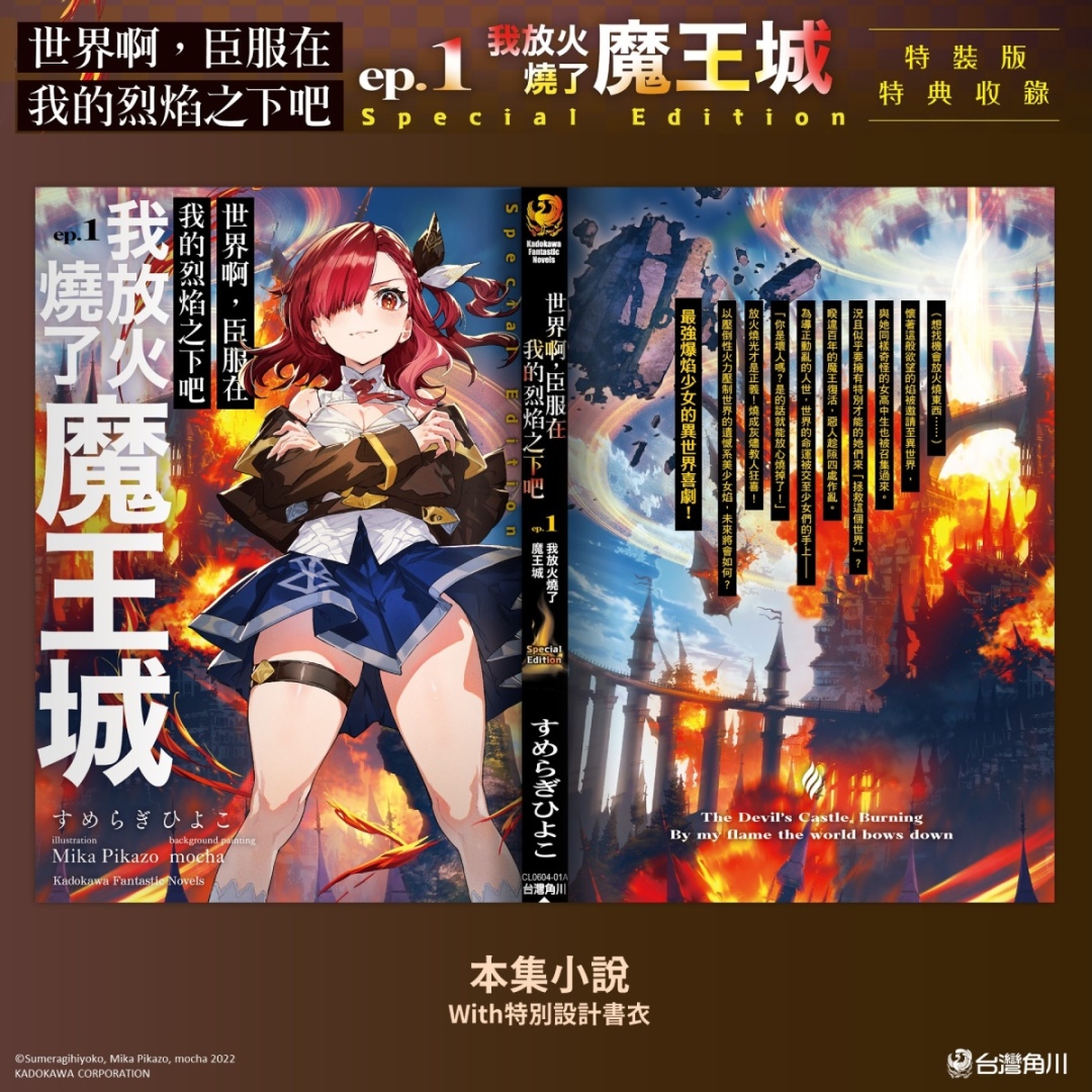 由日本小說家すめらぎひよこ創作,Mika Pikazo擔綱插畫,mocha負責背景作畫的話題輕小說《世界啊,臣服在我的烈焰之下吧 ep.1 我放火燒了魔王城》榮獲日本Sneaker大賞第27屆「大賞」得獎作,是睽違了12年脫穎而出的超重磅佳作,由異世界喜劇的旗手──《為美好的世界獻上爆焰!》作者暁なつめ掛保證大力推薦!本作故事講述最強爆焰美少女從魔王手中拯救世界──把髒東西都燒毀!痛快淋漓的烈焰喜劇華麗登場!四月將在台發售並推出特裝版,即日起開放預購。