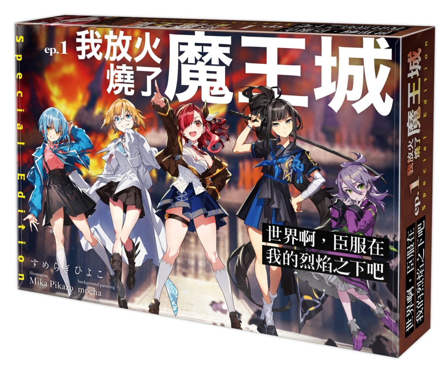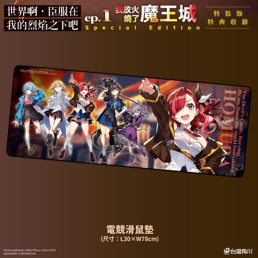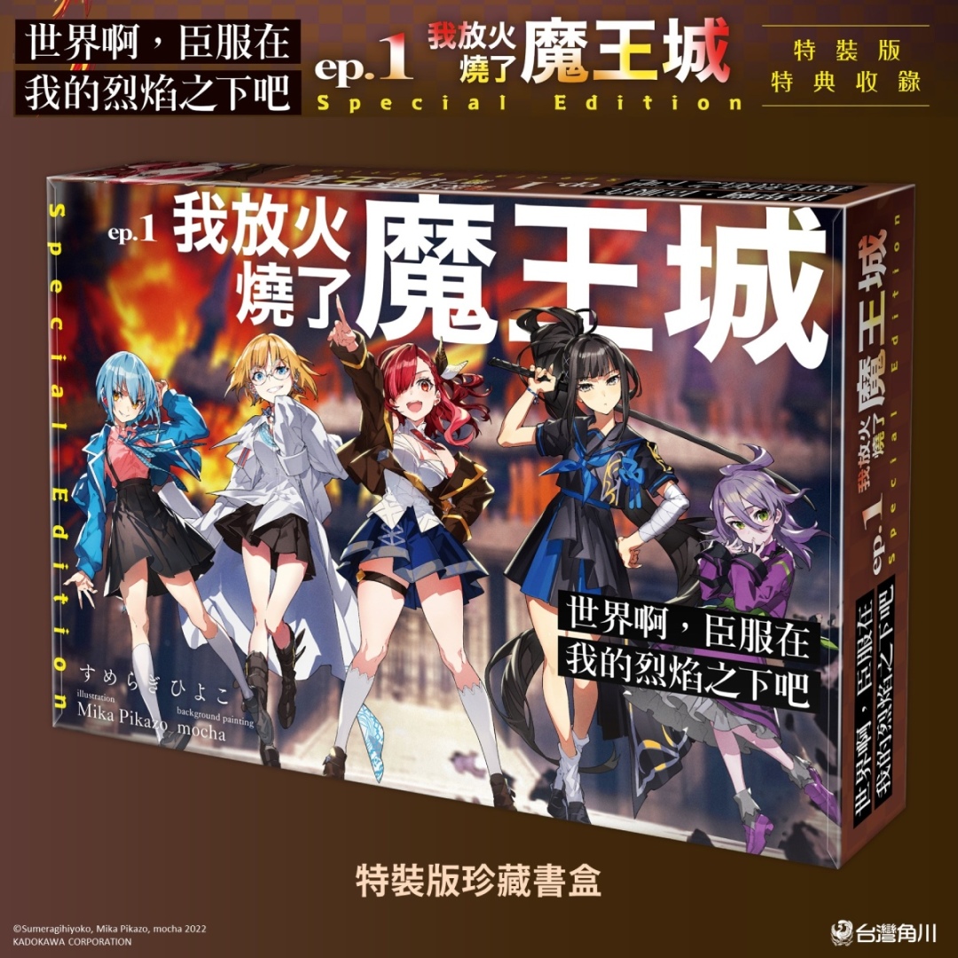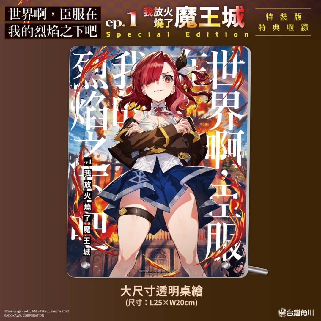 《世界啊,臣服在我的烈焰之下吧 ep.1 我放火燒了魔王城》特裝版收錄限定特典:大尺寸透明桌繪、電競滑鼠墊、本集小說with特別版書衣、特裝版珍藏書盒。自即日起於台灣角川官網與全台指定實體書店開放限期事前預購至2/15(四),於官網完成預購加碼贈送一萬點紅利點數(每會員限兌換乙次)。特裝版上市後數量有限售完為止,有意者請務必把握預購期間,以免向隅。