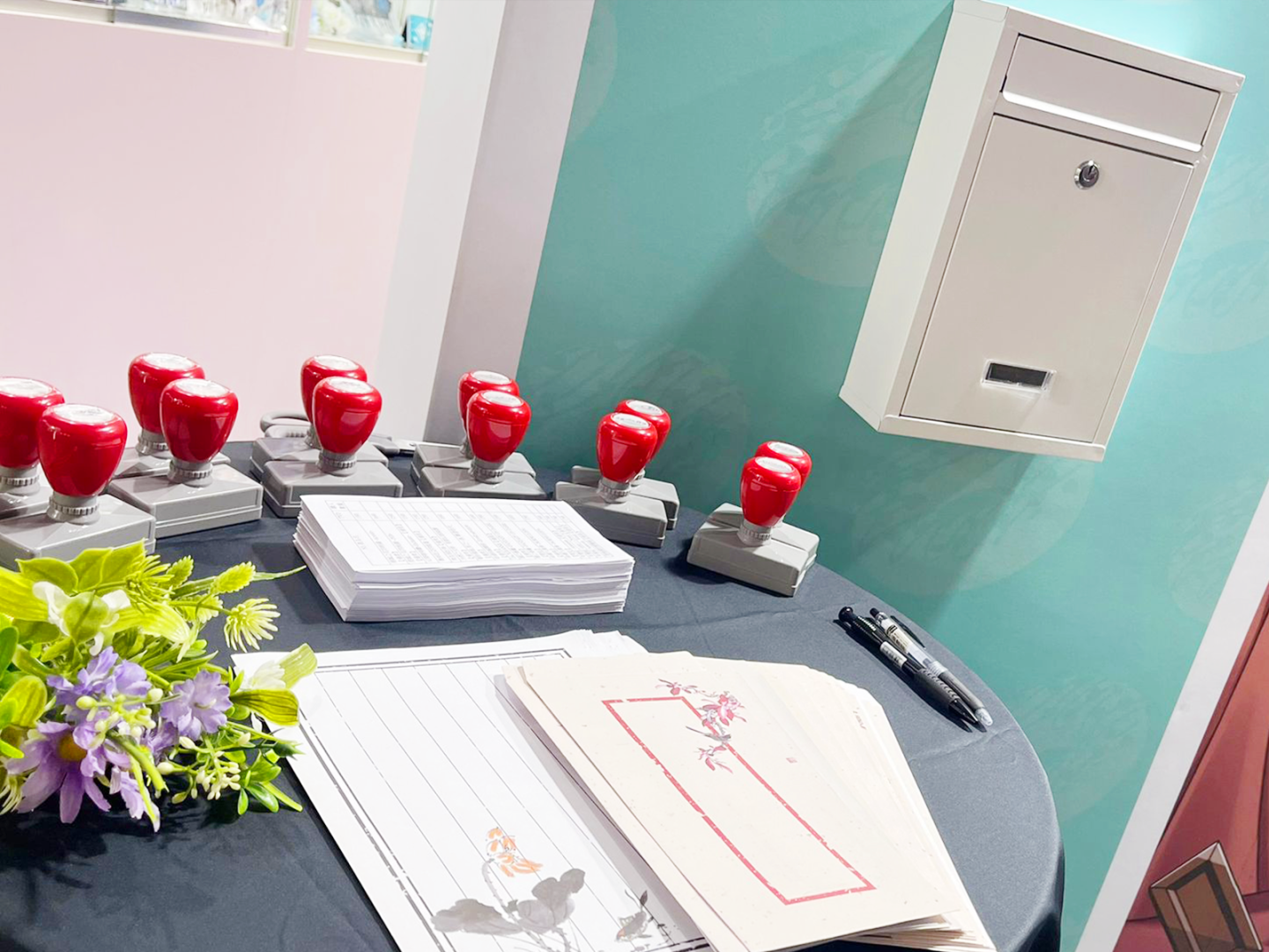 另外,《共生邱比特 -Sweet & Spicy Darling.-》打卡牆旁邊設置了一個「乙女部心願郵箱」,經過我們攤位的粉絲們可以攜帶親手撰寫的感謝信給所喜愛的製作團隊成員及老師,然後將信件投入郵箱內,我們將親自把這些心意書信送交給每位收件人。