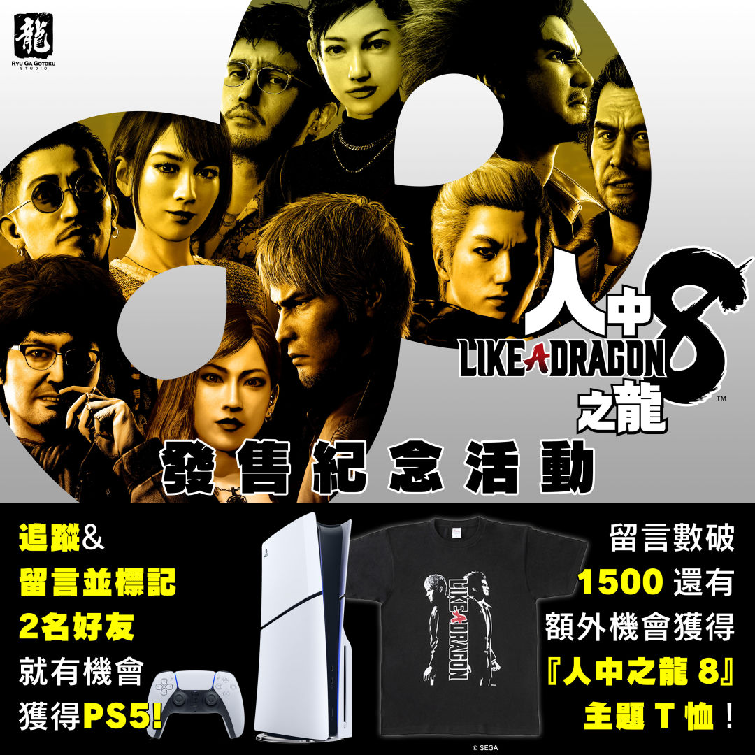 為了慶祝《人中之龍8》的上市,以及讓各多玩家可以感受到《人中之龍》的魅力,人中之龍工作室 Facebook 粉絲專頁現正舉辦抽獎活動,抽選一名粉絲送出一台 PS5。如果留言數超過 1,500 則,再另外加碼送出《人中之龍8》主題T恤(共三件)。