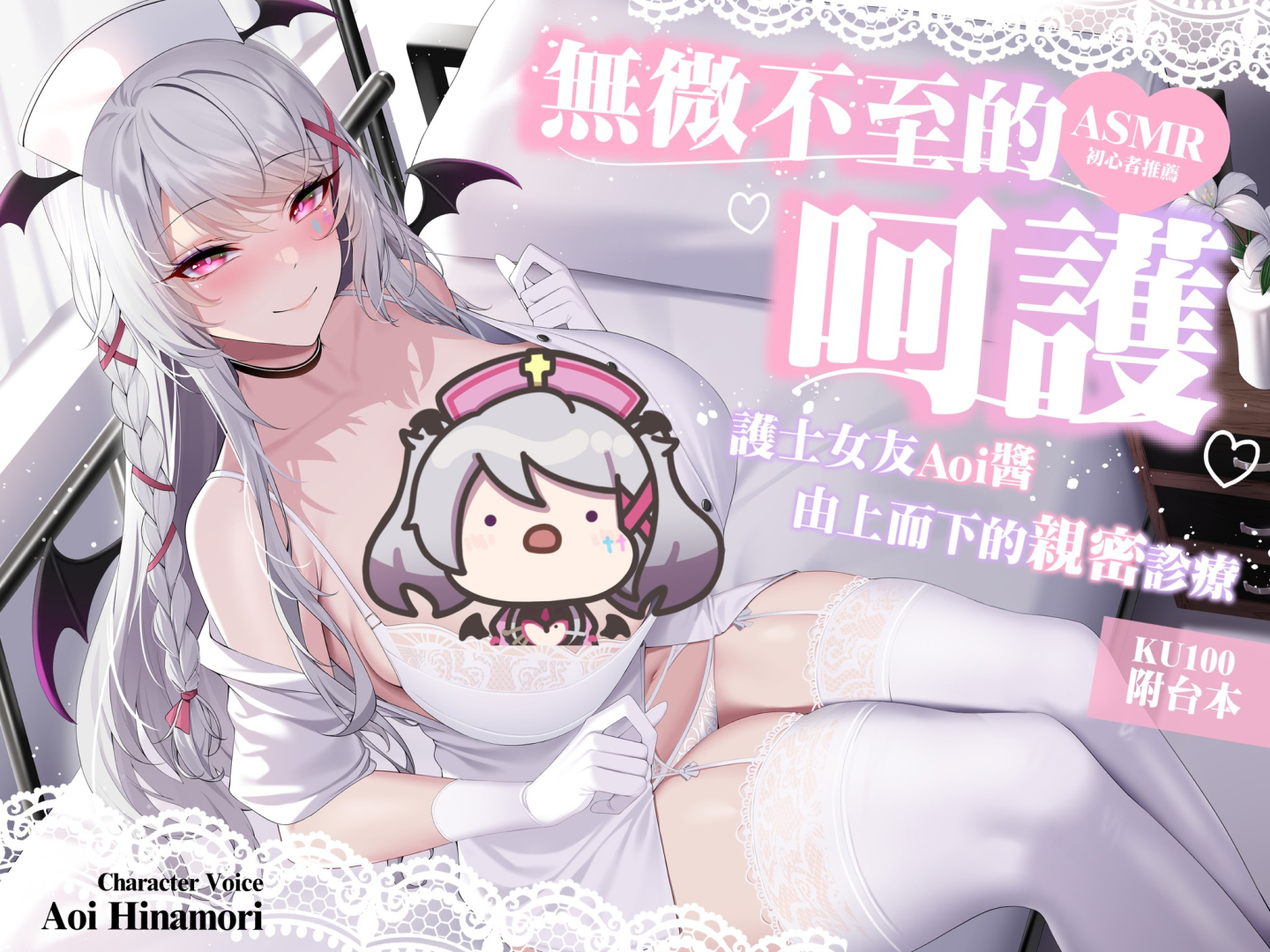 擁有 11.8 萬訂閱的台灣銀盾 Vtuber「Aoi Hinamori」(又叫阿歐依)與音聲社團「雪白薄紗」合作,推出「無微不至的呵護~護士女友Aoi由上而下的親密診療♪」治癒向 ASMR 作品,於 2 月 21 日起在 DLsite 販售。上架短短一天,即廣受觀眾好評,登上 DLsite 聲音排行榜綜合榜第四名,更曾經一度衝上第一名的寶座。