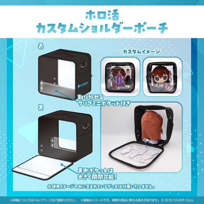 為了讓粉絲們能夠在外展示自己喜歡的偶像周邊,官方特別推出「holo 活帶透明口袋 BIG 後背包」和「holo 活客製單肩包」兩種款式,兩種背包的空間都足以收納「hololive friends with u」系列娃娃,還能將喜歡的吊飾掛在裝飾用的吊環上,或是將立牌和徽章裝飾在上面,單肩包的迷你透明袋子還可以隨個人喜好取下,兩者都附有 hololive 的 Logo 吊飾,想要豐富自己的「holo 活」的粉絲們不要錯過!