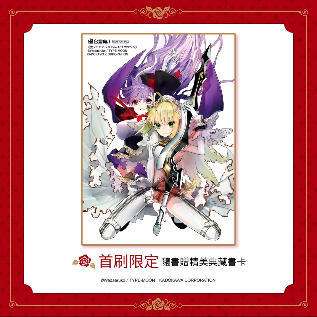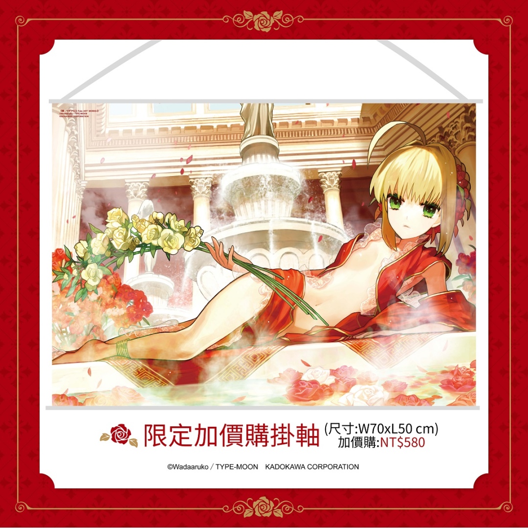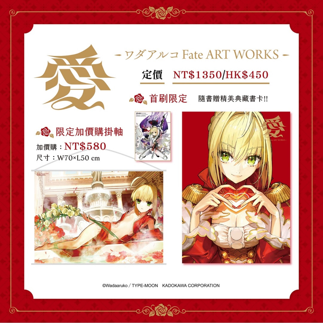本次凡預購《愛 -ワダアルコ Fate ART WORKS-》並同時加價 NT$580,即可獲得超絕唯美的限量「皇帝劇場典藏掛軸(附桿)」乙個(尺寸:W70 × H50 cm)。預購期間凡於台灣角川官網完成預購,再加碼贈送官網一萬點紅利點數(※每會員限兌換乙次,將於出貨後陸續發送),有意者請把握預購機會,以免向隅。