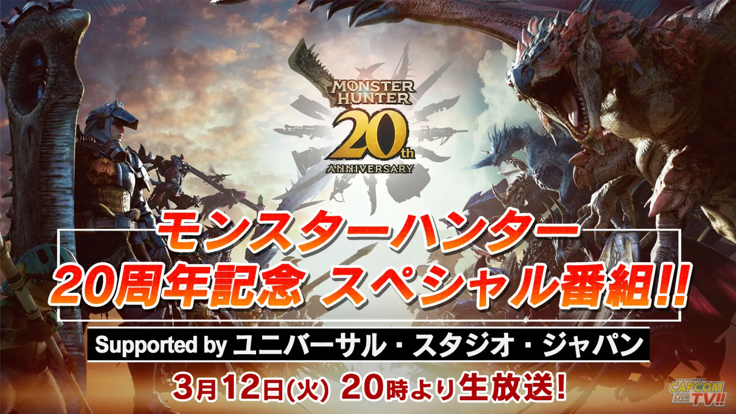 參與《魔物獵人》系列的總監、製作人們的談話環節(※錄製)、並介紹環球影城日 3月 1 日起舉辦的「魔物獵人 USJ 祭」的情況,以及其他與 20 週年紀念相關的資訊,並邀請了多位嘉賓一同參與,節目預計約 2 小時。官方強調「本次特別節目並不包含新作消息或者有關《魔物獵人荒野》的新聞」