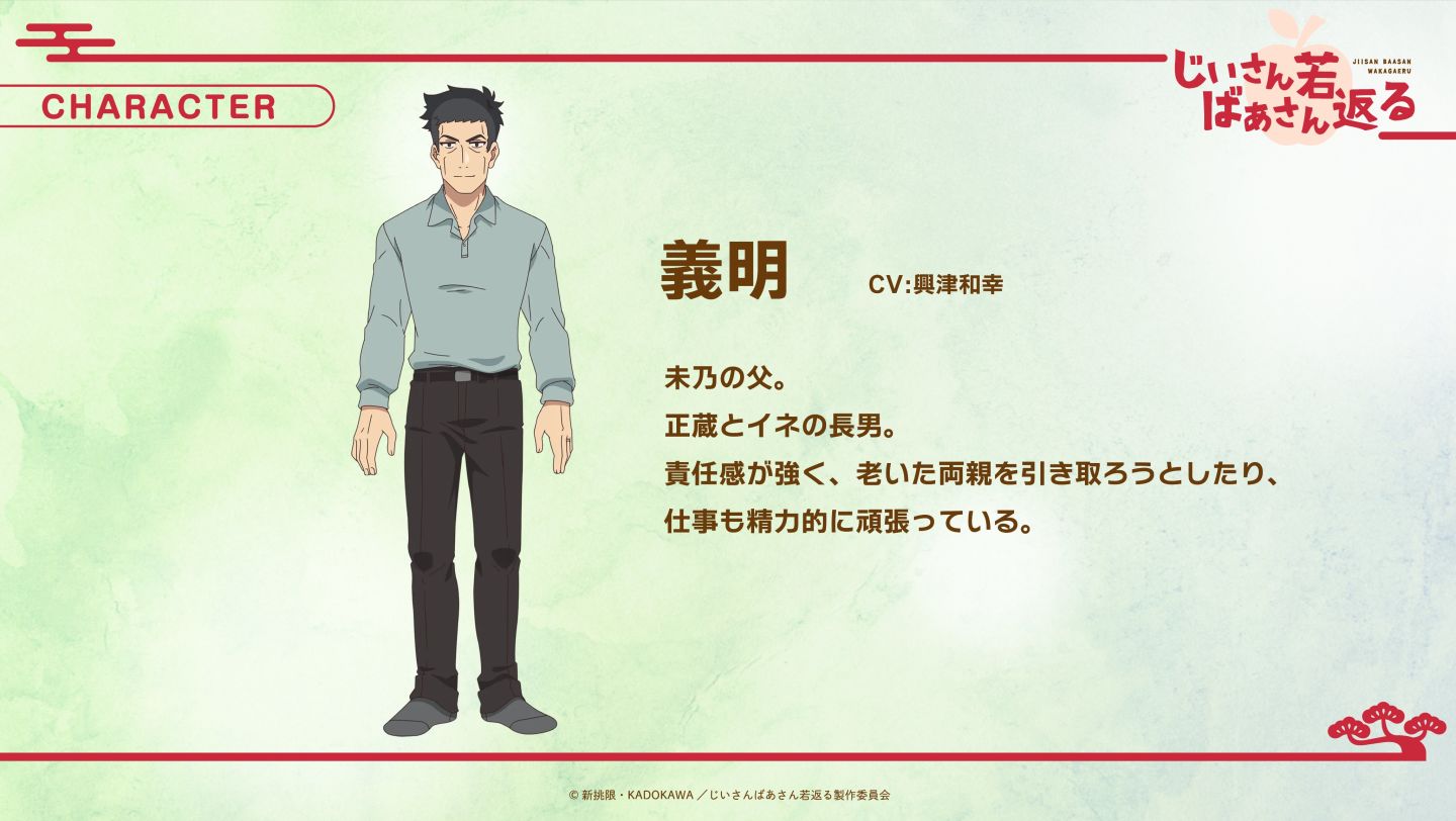 義明(CV:興津和幸):依音和正藏的長子,有很強的責任感,試圖接替年邁的父母努力工作著。