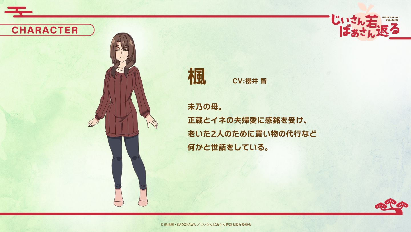 楓(CV:櫻井智):義明的妻子,對正藏和依音之間深厚的夫妻愛感動,以各種方式照顧著他們,包括幫年邁的兩人買東西。