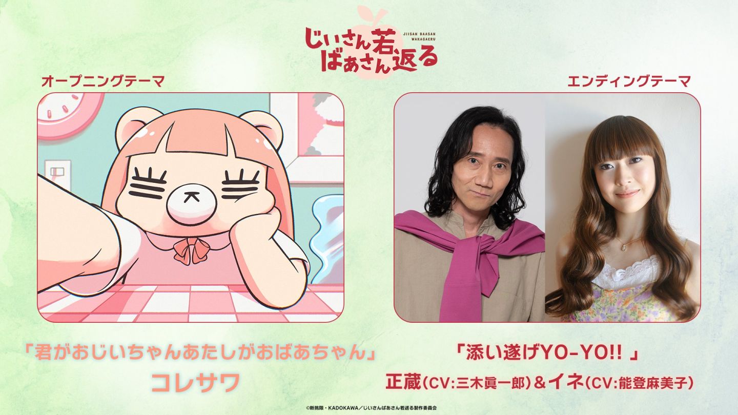 與此同時也公布動畫主題曲〈君がおじいちゃんあたしがおばあちゃん〉將由新生代創作女歌手「コレサワ」演唱,片尾曲〈添い遂げYO-YO!!〉則由三木真一郎與能登麻美子合唱。