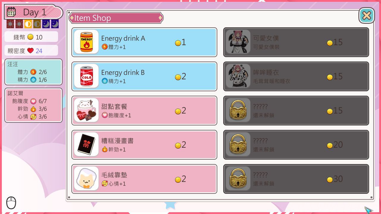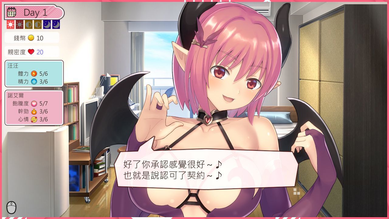 正如標題所述,本作便是模擬與魅魔締結契約的同居生活,玩家在遊戲中可以打工賺取金錢,然後買些色色服裝、帶諾艾爾出門約會、和她聊天、進行親密互動……等等。當然對手是魅魔,在色色部份也有著高配合度,各種服裝各種場合都能玩,太久不碰她還會被單方面反向推倒,玩家能做的事就是在心理和生理上都持續滿足諾艾爾,好感度差別也將影響結局出入。