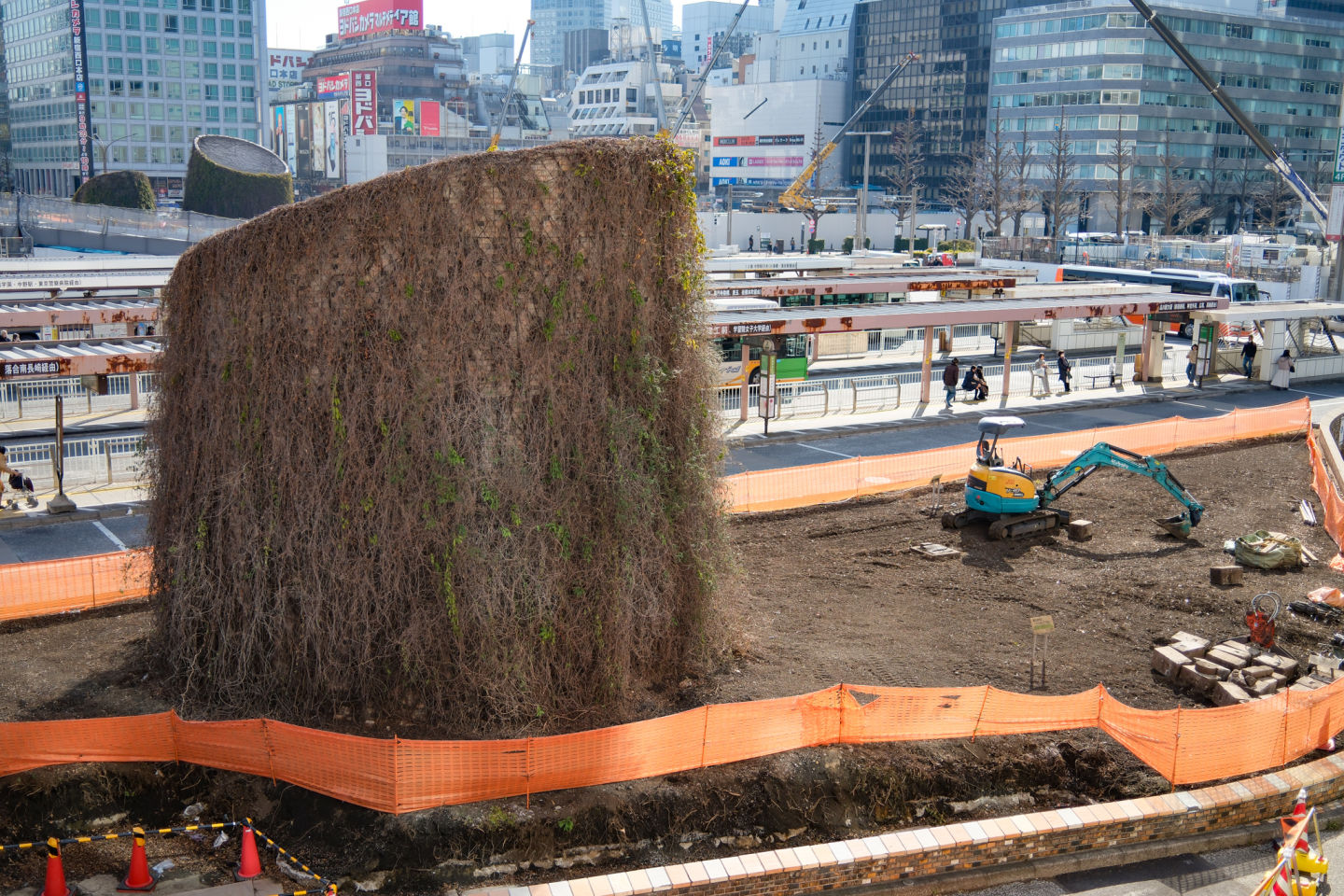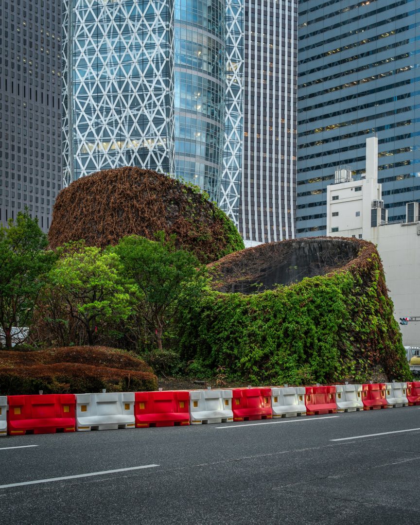 因為覆滿植物而更增未知氛圍的巨型筒狀物,其實是連結地下停車場的通風塔,在西口廣場共有4座。1966年11月完工至今,伴隨著新宿走過了昭和、平成、令和三個世代,雖然外觀已被雜草和爬牆虎包圍,但實際還是有在繼續作用,也因此近期西口進行大規模拆除時,即使周邊被夷為平地,它仍矗立原地與周邊景色形成強烈對比,也難怪日本網友形容這座通風塔有種「不可觸碰」的感覺。
