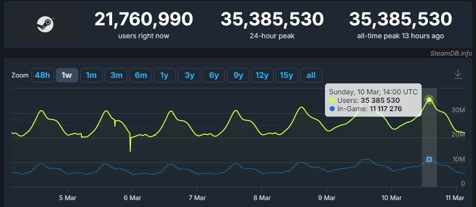 PC 遊戲平台 Steam 人氣持續上升,近期不斷刷新同時上線人數記錄,在近日突破 3,450 萬人次後,於 10 日再度達到高峰,正式到達 3,500 萬人次。