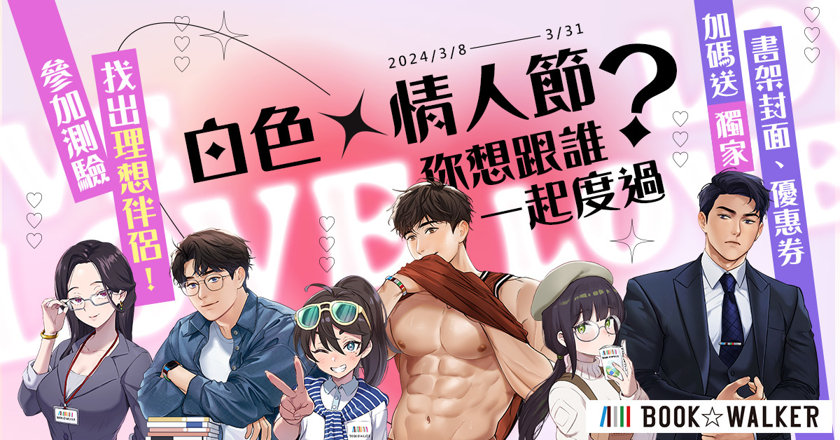 白色情人節將近!BOOK☆WALKER 推出一系列戀愛主題相關活動書展,為讀者們帶來滿滿心動能量。首先登場的是「白色情人節,你想跟誰一起度過?參加測驗找出理想伴侶」,特邀繪師日輪、夏阿特,帶來六位心儀對象,即日起至 3/25 首次參加理想伴侶測驗,就能獲得 50 元優惠券、獨家限定書架封面。專屬戀愛推薦書單包括:《式守同學不只可愛而已》、《不會拿捏距離的阿波連同學》、即將完結的《高嶺&花》。活動期間不限遊玩次數,歡迎多多解鎖,蒐集精美書架,收藏好看故事!