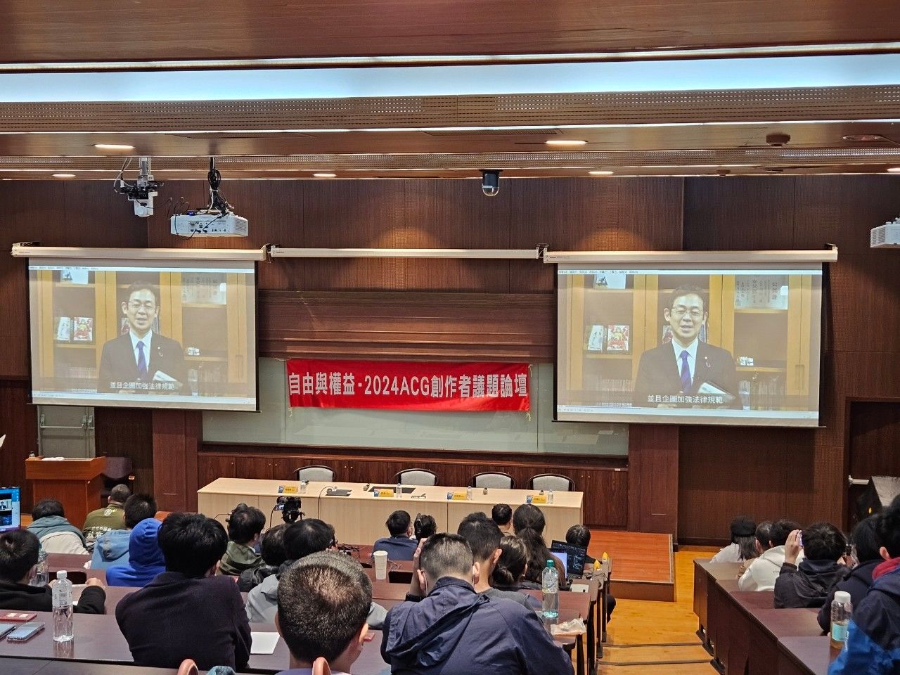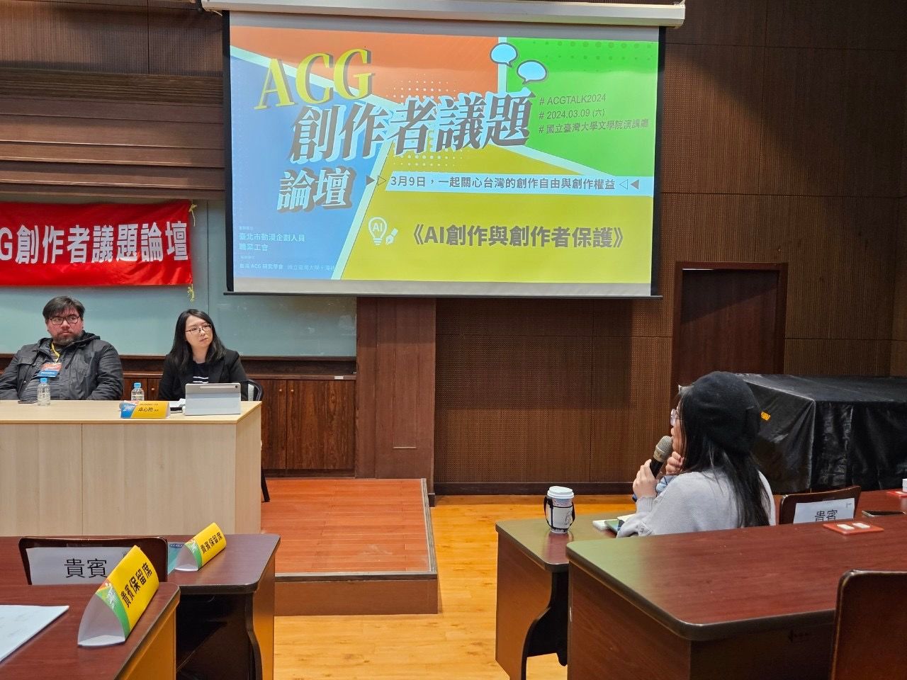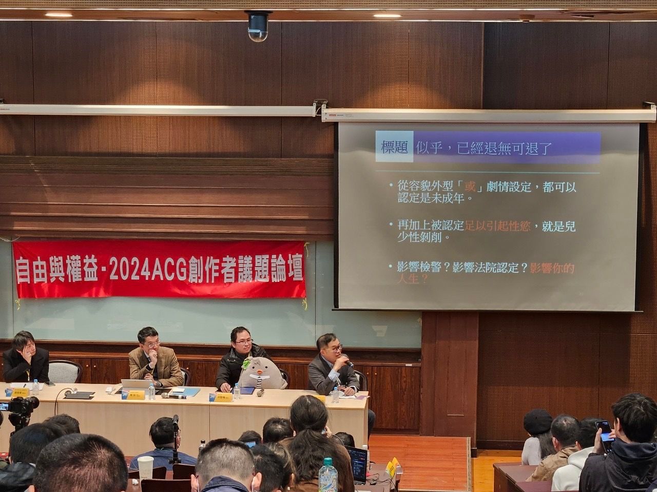 由臺北市動漫企劃人員職業工會(下稱:動漫工會)主辦,台灣 ACG 研究學會、國立臺灣大學卡通漫畫研究社協辦的「自由與權益—2024 ACG 創作者議題論壇」於本月 9 日在國立臺灣大學文學院舉行。此次論壇邀集國內創作者、業者、律師、教師、治療師等各界代表,共同就「創作自由」等主題發表意見。多名日本國會議員、日本創作巨擘並以錄影方式,表達對臺灣創作自由限縮的高度關注。