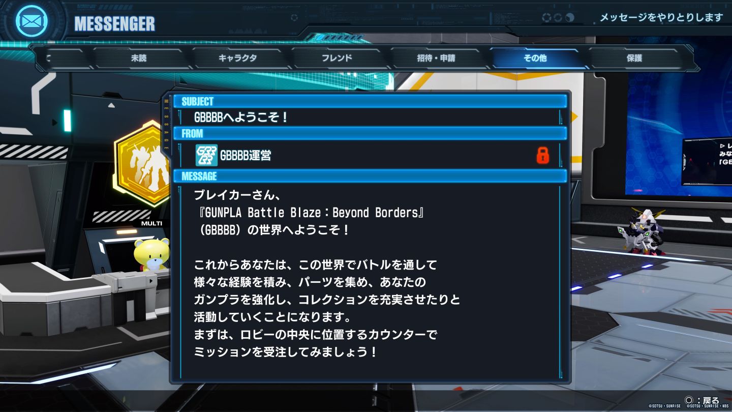 本作舞台將玩家帶入有如線上遊戲的舞台《GBBBB》當中,玩家的 AVATAR 即是自己組裝出來的模型。如果有看過動畫《鋼彈創鬥者》系列的粉絲的不會太陌生,而且在多人大廳的環境中,不僅可以與他人社交動作互動,還可以觀賞到 GBBBB 其他玩家組裝的模型展示大廳、還有遊戲內的特殊宣傳動畫,可以預期主線劇情也與線上電競活動有關連。