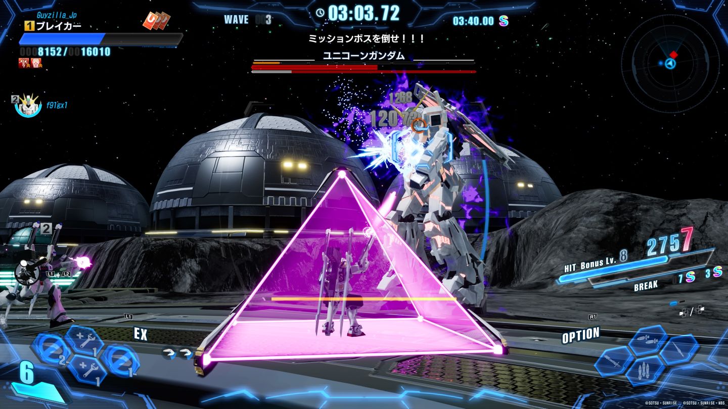 透過實戰指令面板「OP SKILL」切換,基本有補血,打到特殊零件如 RX93 Nu 鋼彈就能使用「翼狀感應砲、I 立場」等特技,最多可以有八種攻擊手段,需要攻擊累積能量,或者技能冷卻結束後使用,可以打出相當多彩的連段數量。
