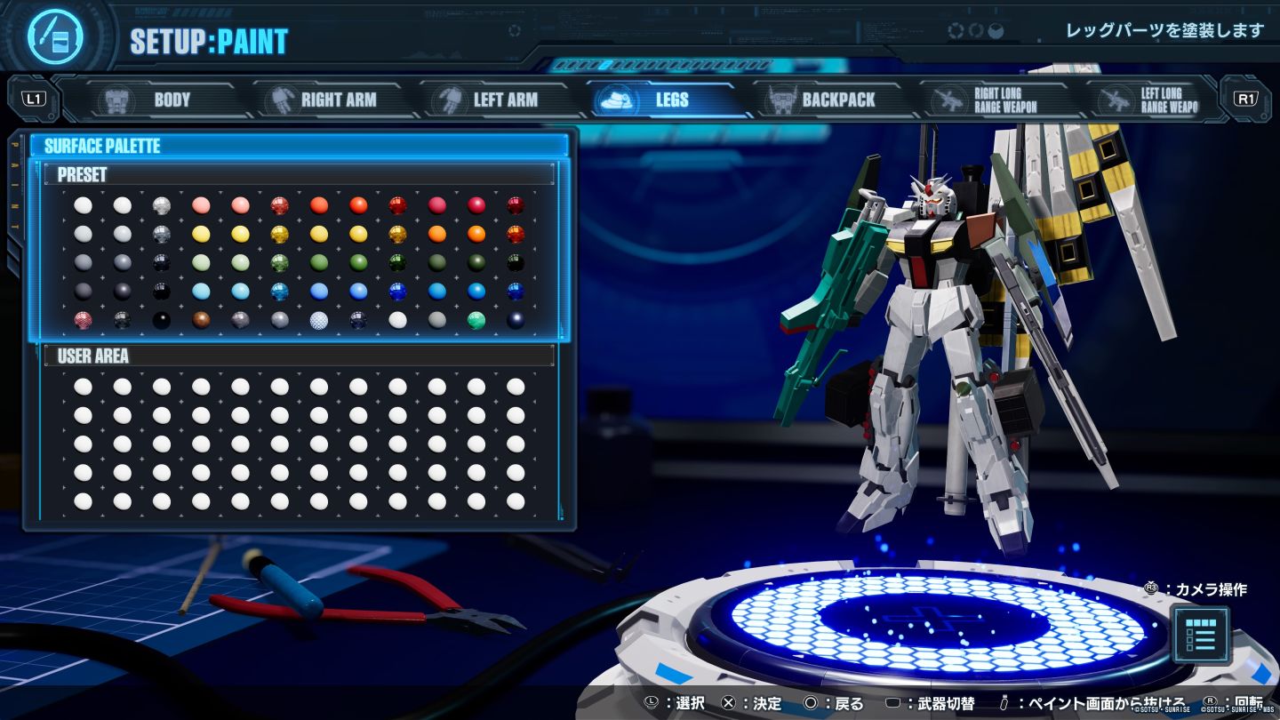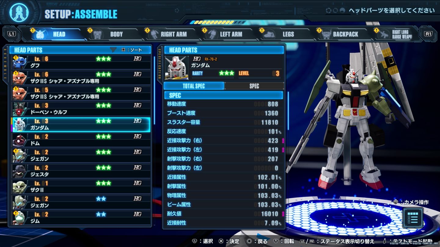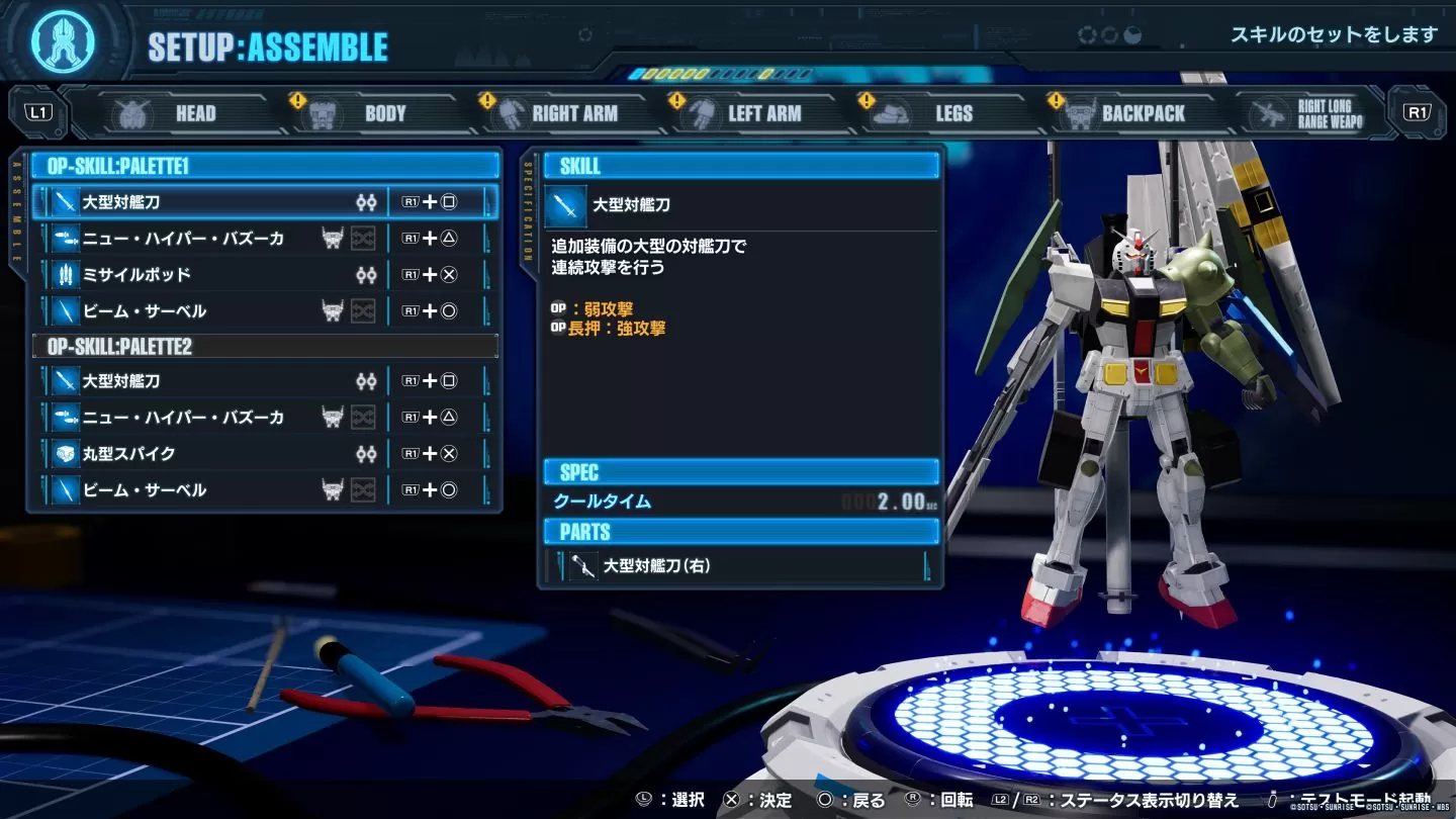 頭部、軀幹、右手、左手、腳部、背包、左右兩側的近身武器&遠程武器、盾牌,11 部位 可供任意搭配只是基礎,玩家還可以安裝更多武器零件,目前可以看到的有「大型斬艦刀、SHIELD BIT、火神砲」等種類。