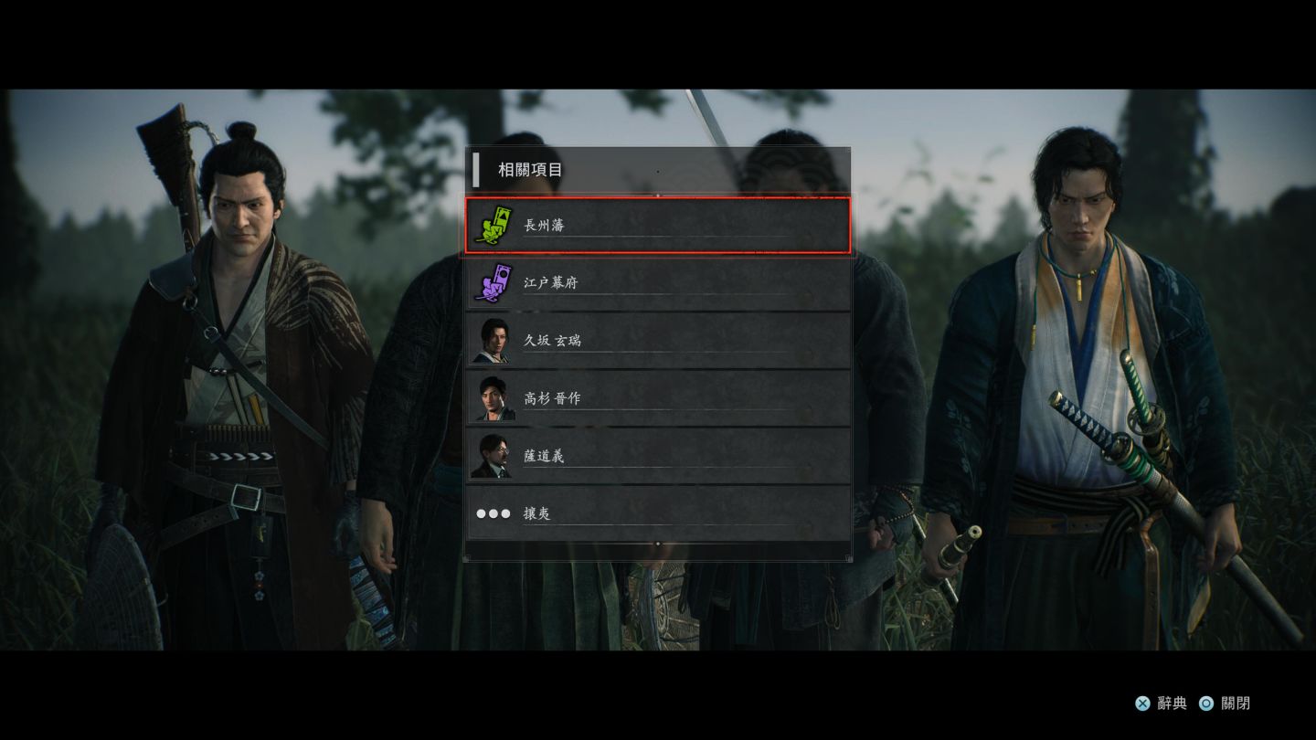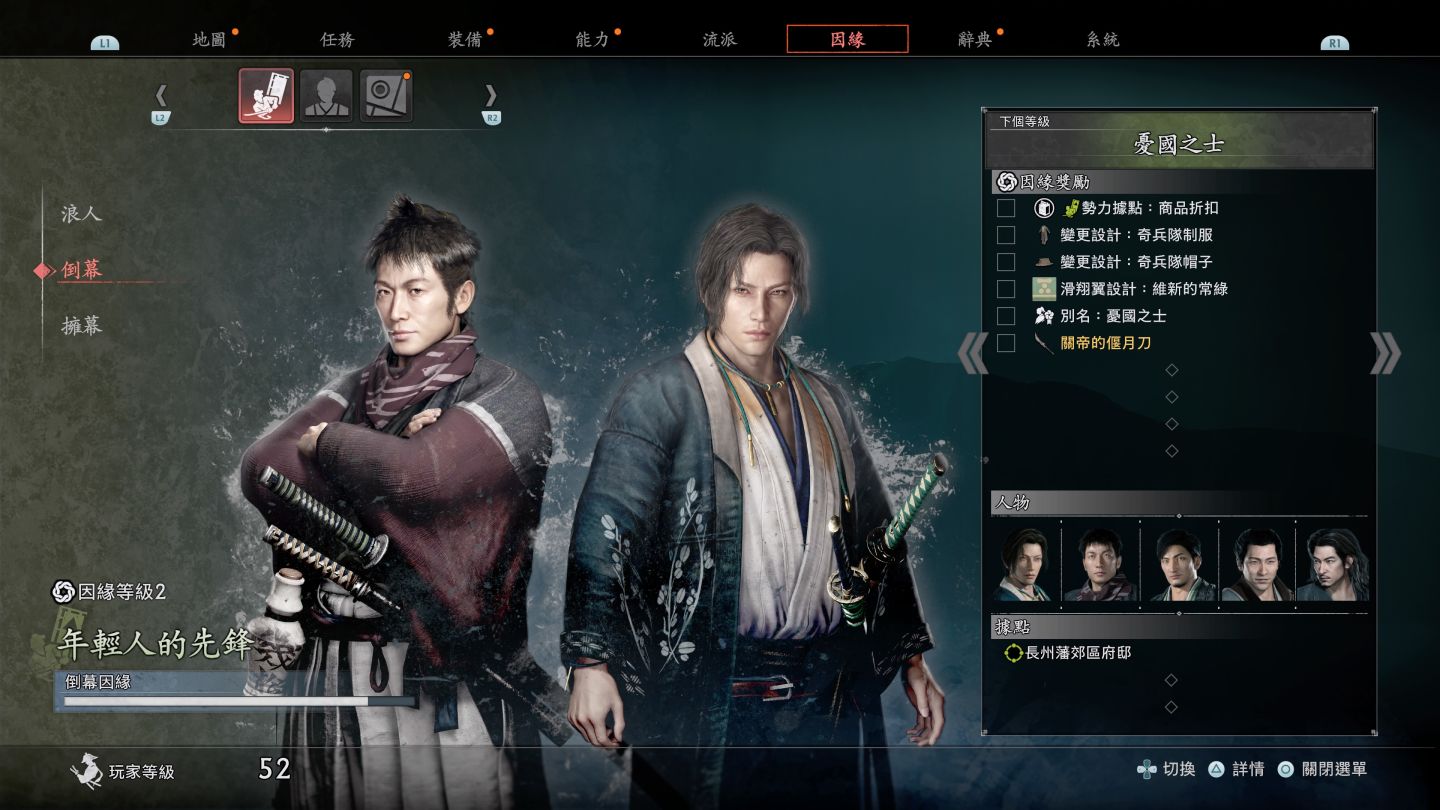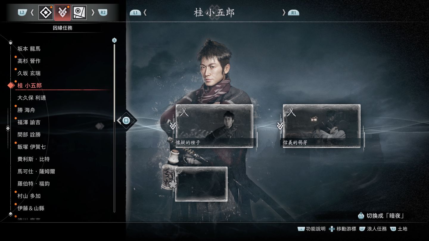 《浪人崛起》給玩家的第一印象會是像個《對馬戰鬼》,但是 Team Ninja 與光榮利用了「因緣」這份宛如羈絆的元素,走出了不同的道路。首先玩家一開始只有自己的流派,可能無法面對足夠強大的敵人,但是隨著因緣任務的加入,玩家有機會在關卡任務時能夠與許多幕末名人並肩作戰,而比臥龍更佳的作法,玩家有機會切換成盟友的角色,使用他們的流派擊敗對手。