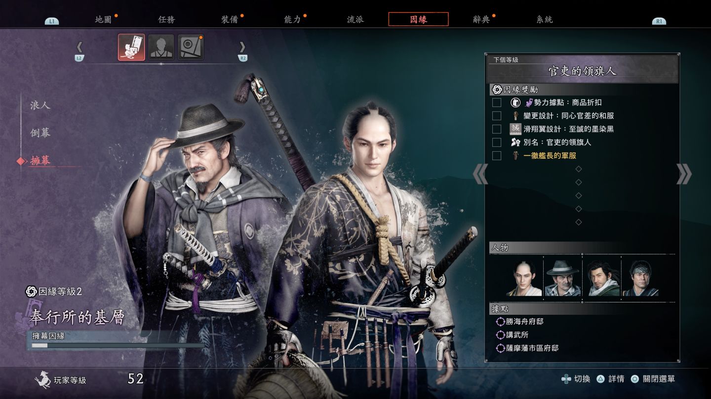 在所謂的「因緣任務」中能了解建立關係的許多名人,他們的存在感可不是只有在任務當中,當玩家在關卡使用不同陣營的盟友同時出戰時,甚至可以看到不同派系角色鬥嘴的有趣場面。因緣任務作為了解他們的動機而設計,同時與這些人物的因緣等級也會提升。你會從其他浪人和因緣角色那裡學到很多戰鬥技巧,此外這些支線任務也會對故事情節產生影響,甚至關係到盟友的生死命運。