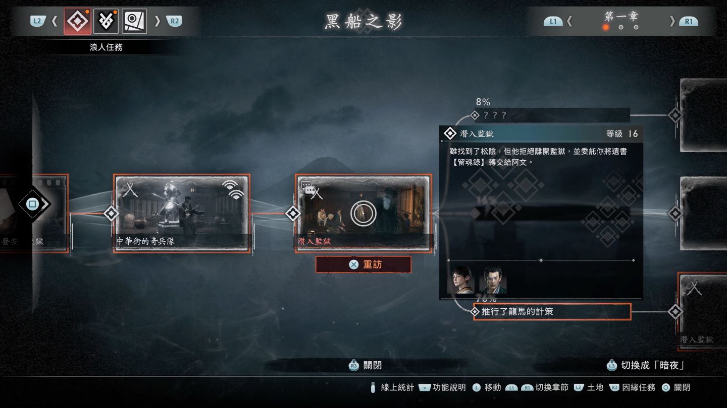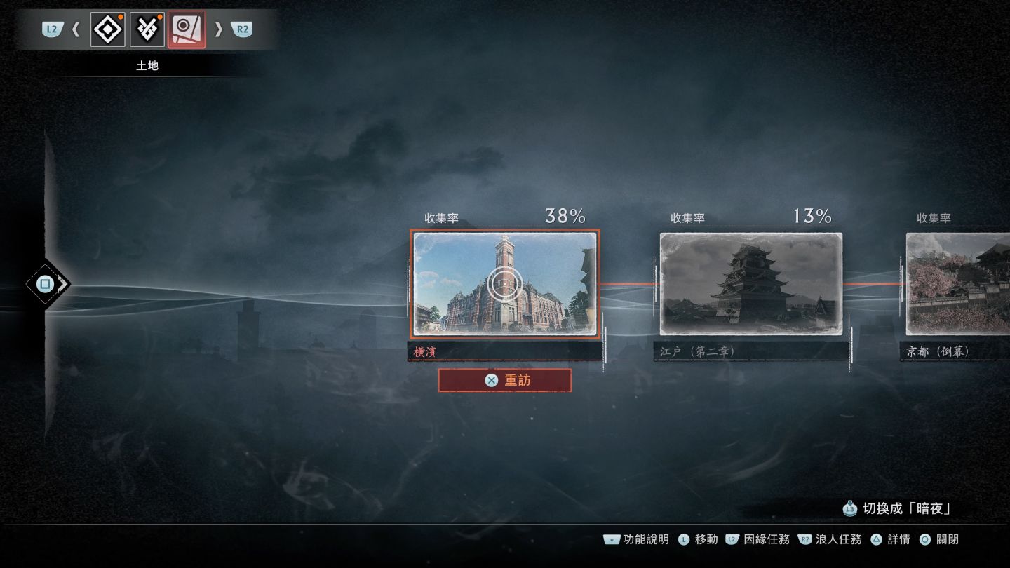 由於是在史實中的虛構角色,玩家扮演的隱刀將藉由探索橫濱、江戶、京都三大區域來累積「因緣」,對於時常在接觸開放世界的玩家這並不陌生也就不特別贅述,光是看到地圖的圖示就能夠明瞭這次的開放世界設計還是採用了清單式的架構,不過屬於選擇性內容,對於清單開放世界厭倦的玩家也不會影響到主線的進行。