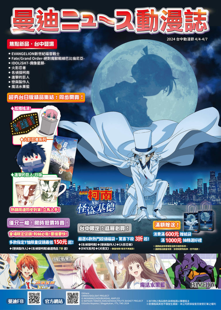 3/29 起上映總集篇的《名偵探柯南》話題正夯!本次動漫節除了熱門台版商品,更多豐富日版週邊更是限量販售。包含近期討論度相當高的「天體觀測」「百鬼夜行」等系列,甜品風格可愛商品也讓人愛不釋手,數量有限售完不補。粉絲特別注意,今年總集篇及劇場版主角怪盜基德的各項帥氣商品襲來,進戲院前快來補充專屬週邊吧!